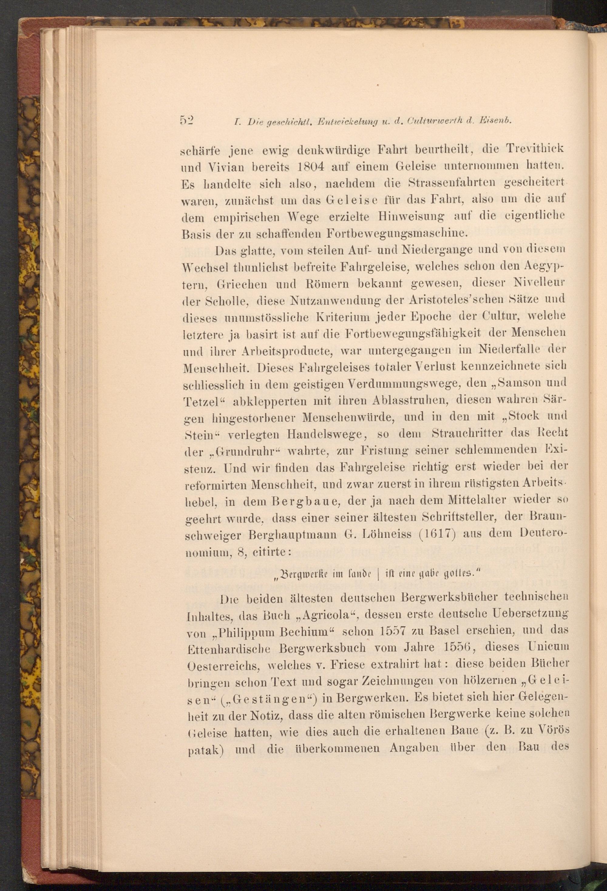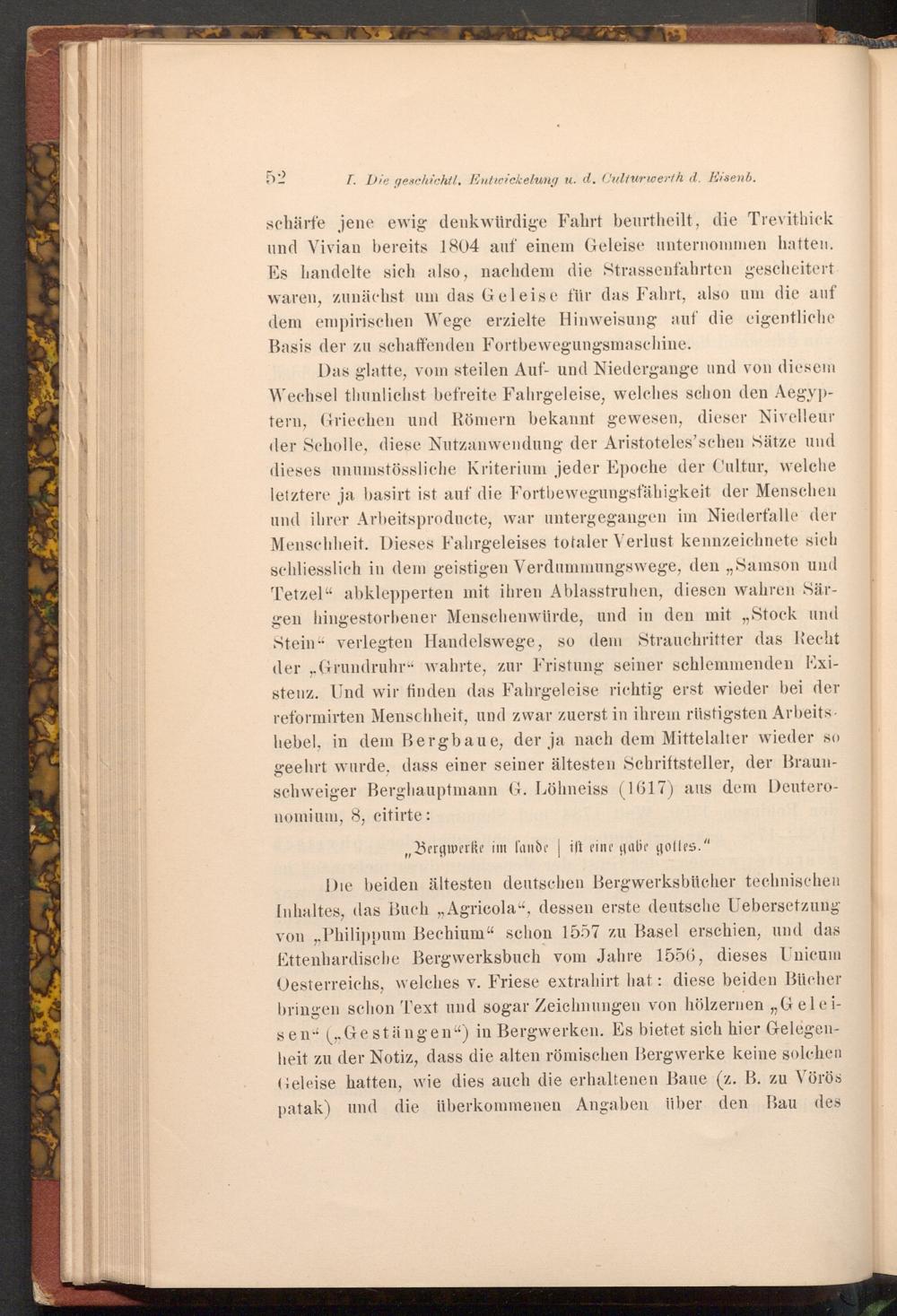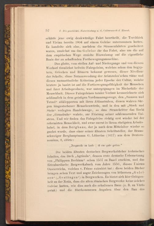 Das glatte, vom steilen Auf- und Niedergange und von diesem Wechsel thunlichst befreite Fahrgeleise, welches schon den Aegyptern, Griechen und Römern bekannt gewesen, dieser Nivelleur der Scholle, diese Nutzanwendung der Aristoteles'schen Sätze und dieses unumstössliche Kriterium jeder Epoche der Cultur, welche letztere ja basirt ist auf die Fortbewegungsfähigkeit der Menschen und ihrer Arbeitsproducte, war untergegangen im Niederfalle der Menschheit. Dieses Fahrgeleises totaler Verlust kennzeichnete sich schliesslich in dem geistigen Verdummungswege, den„ Samson und Tetzel" abklepperten mit ihren Ablasstruhen, diesen wahren Särgen hingestorbener Menschenwürde, und in den mit„ Stock und Stein" verlegten Handelswege, so dem Strauchritter das Recht der„ Grundruhr" wahrte, zur Fristung seiner schlemmenden Existenz. Und wir finden das Fahrgeleise richtig erst wieder bei der reformirten Menschheit, und zwar zuerst in ihrem rüstigsten Arbeits. hebel, in dem Bergbaue, der ja nach dem Mittelalter wieder so geehrt wurde, dass einer seiner ältesten Schriftsteller, der Braunschweiger Berghauptmann G. Löhneiss( 1617) aus dem Deuteronomium, 8, citirte: