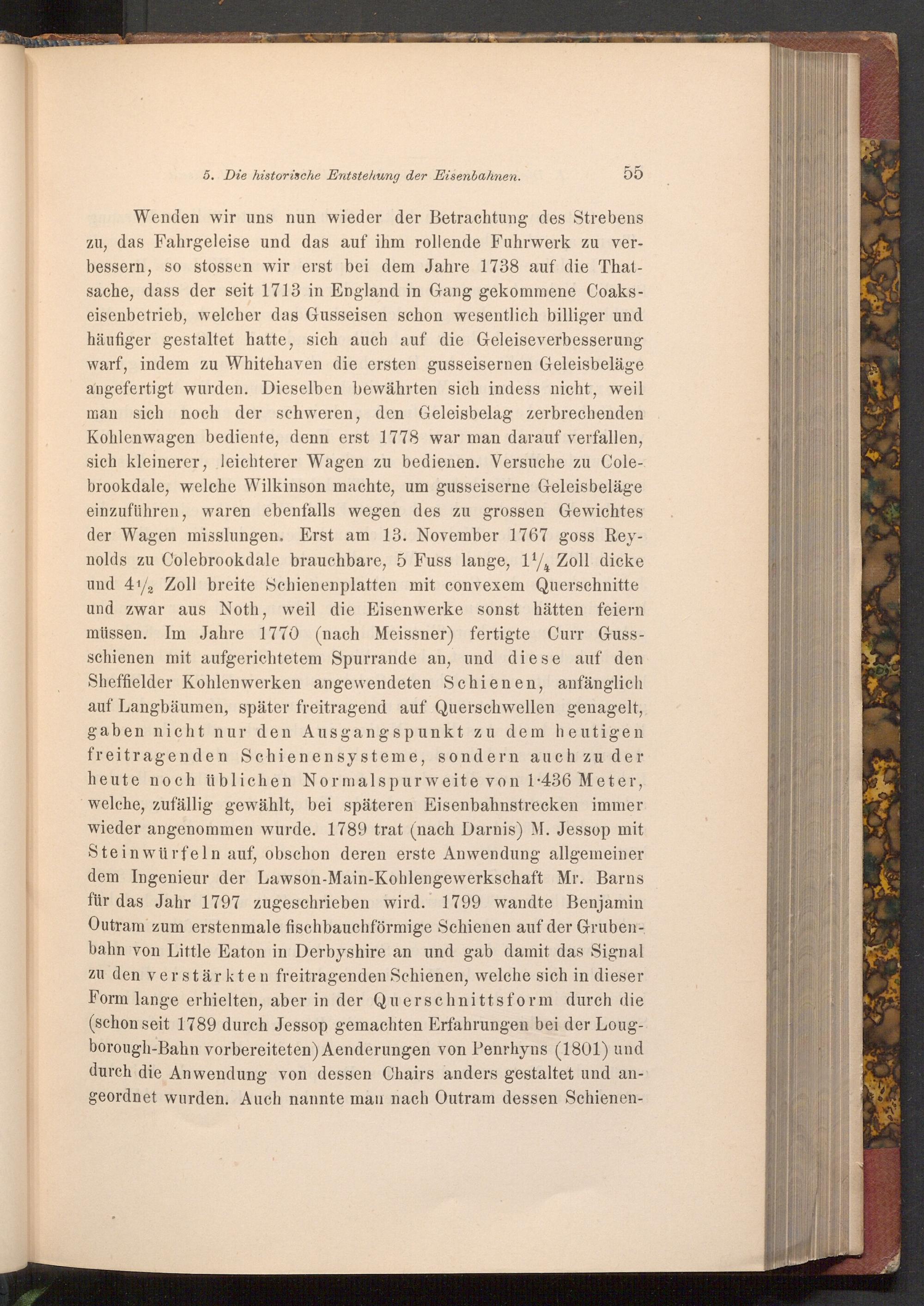 Wenden wir uns nun wieder der Betrachtung des Strebens zu, das Fahrgeleise und das auf ihm rollende Fuhrwerk zu verbessern, so stossen wir erst bei dem Jahre 1738 auf die Thatsache, dass der seit 1713 in England in Gang gekommene Coakseisenbetrieb, welcher das Gusseisen schon wesentlich billiger und häufiger gestaltet hatte, sich auch auf die Geleiseverbesserung warf, indem zu Whitehaven die ersten gusseisernen Geleisbeläge angefertigt wurden. Dieselben bewährten sich indess nicht, weil man sich noch der schweren, den Geleisbelag zerbrechenden Kohlenwagen bediente, denn erst 1778 war man darauf verfallen, sich kleinerer, leichterer Wagen zu bedienen. Versuche zu Colebrookdale, welche Wilkinson machte, um gusseiserne Geleisbeläge einzuführen, waren ebenfalls wegen des zu grossen Gewichtes der Wagen misslungen. Erst am 13. November 1767 goss Reynolds zu Colebrookdale brauchbare, 5 Fuss lange, 1, Zoll dicke und 41 Zoll breite Schienenplatten mit convexem Querschnitte und zwar aus Noth, weil die Eisenwerke sonst hätten feiern müssen. Im Jahre 1770( nach Meissner) fertigte Curr Gussschienen mit aufgerichtetem Spurrande an, und diese auf den Sheffielder Kohlenwerken angewendeten Schienen, anfänglich auf Langbäumen, später freitragend auf Querschwellen genagelt, gaben nicht nur den Ausgangspunkt zu dem heutigen freitragenden Schienensysteme, sondern auch zu der heute noch üblichen Normalspurweite von 1-436 Meter, welche, zufällig gewählt, bei späteren Eisenbahnstrecken immer wieder angenommen wurde. 1789 trat( nach Darnis) M. Jessop mit Steinwürfeln auf, obschon deren erste Anwendung allgemeiner dem Ingenieur der Lawson- Main- Kohlengewerkschaft Mr. Barns für das Jahr 1797 zugeschrieben wird. 1799 wandte Benjamin Outram zum erstenmale fischbauchförmige Schienen auf der Grubenbahn von Little Eaton in Derbyshire an und gab damit das Signal zu den verstärkten freitragenden Schienen, welche sich in dieser Form lange erhielten, aber in der Querschnittsform durch die ( schon seit 1789 durch Jessop gemachten Erfahrungen bei der Lougborough- Bahn vorbereiteten) Aenderungen von Penrhyns( 1801) und durch die Anwendung von dessen Chairs anders gestaltet und angeordnet wurden. Auch nannte man nach Outram dessen Schienen