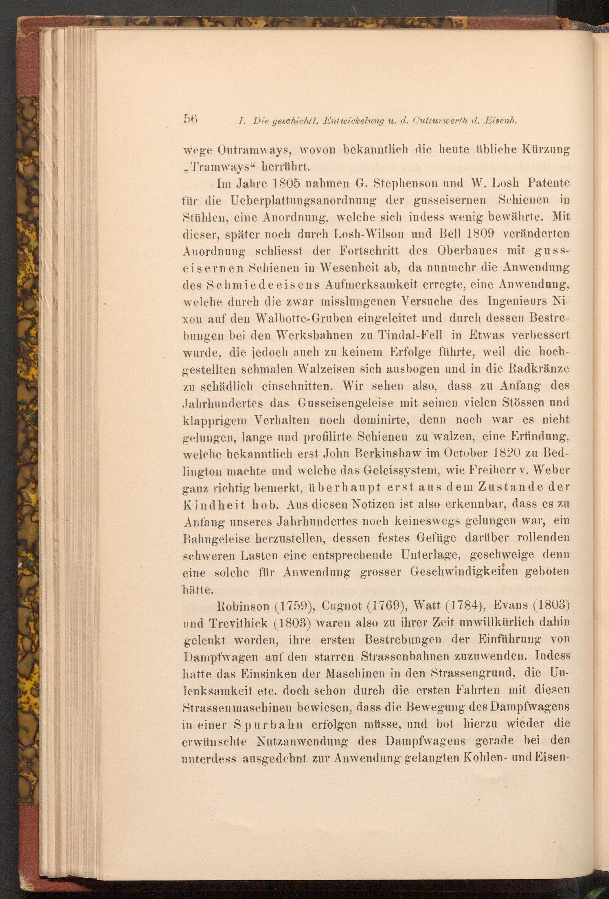 Robinson( 1759), Cugnot( 1769), Watt( 1784), Evans( 1803) und Trevithick( 1803) waren also zu ihrer Zeit unwillkürlich dahin gelenkt worden, ihre ersten Bestrebungen der Einführung von Dampfwagen auf den starren Strassenbahnen zuzuwenden. Indess hatte das Einsinken der Maschinen in den Strassengrund, die Unlenksamkeit etc. doch schon durch die ersten Fahrten mit diesen Strassenmaschinen bewiesen, dass die Bewegung des Dampfwagens in einer Spurbahn erfolgen müsse, und bot hierzu wieder die erwünschte Nutzanwendung des Dampfwagens gerade bei den unterdess ausgedehnt zur Anwendung gelangten Kohlen- und Eisen
