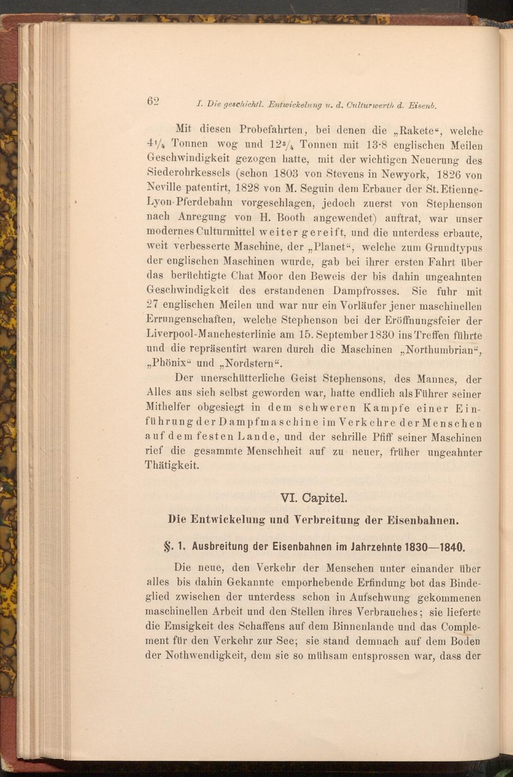 Mit diesen Probefahrten, bei denen die„ Rakete", welche 41 Tonnen wog und 123/4 Tonnen mit 13.8 englischen Meilen Geschwindigkeit gezogen hatte, mit der wichtigen Neuerung des Siederohrkessels( schon 1803 von Stevens in Newyork, 1826 von Neville patentirt, 1828 von M. Seguin dem Erbauer der St. EtienneLyon Pferdebahn vorgeschlagen, jedoch zuerst von Stephenson nach Anregung von H. Booth angewendet) auftrat, war unser modernes Culturmittel weiter gereift, und die unterdess erbaute, weit verbesserte Maschine, der" Planet", welche zum Grundtypus der englischen Maschinen wurde, gab bei ihrer ersten Fahrt über das berüchtigte Chat Moor den Beweis der bis dahin ungeahnten Geschwindigkeit des erstandenen Dampfrosses. Sie fuhr mit 27 englischen Meilen und war nur ein Vorläufer jener maschinellen Errungenschaften, welche Stephenson bei der Eröffnungsfeier der Liverpool- Manchesterlinie am 15. September 1830 ins Treffen führte und die repräsentirt waren durch die Maschinen„ Northumbrian", Phönix" und" Nordstern".