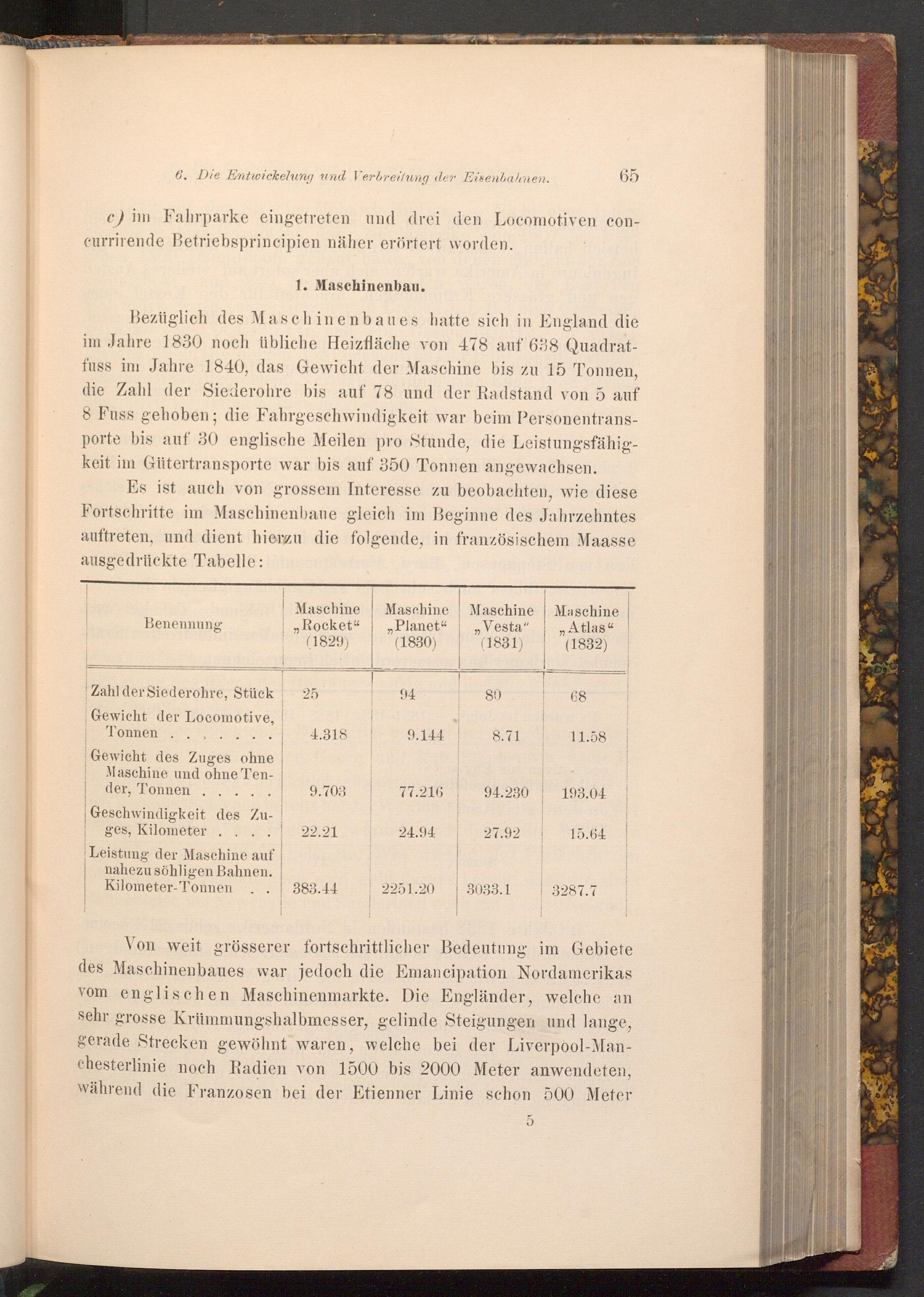 Bezüglich des Maschinenbaues hatte sich in England die im Jahre 1830 noch übliche Heizfläche von 478 auf 638 Quadratfuss im Jahre 1840, das Gewicht der Maschine bis zu 15 Tonnen, die Zahl der Siederohre bis auf 78 und der Radstand von 5 auf 8 Fuss gehoben; die Fahrgeschwindigkeit war beim Personentransporte bis auf 30 englische Meilen pro Stunde, die Leistungsfähigkeit im Gütertransporte war bis auf 350 Tonnen angewachsen.