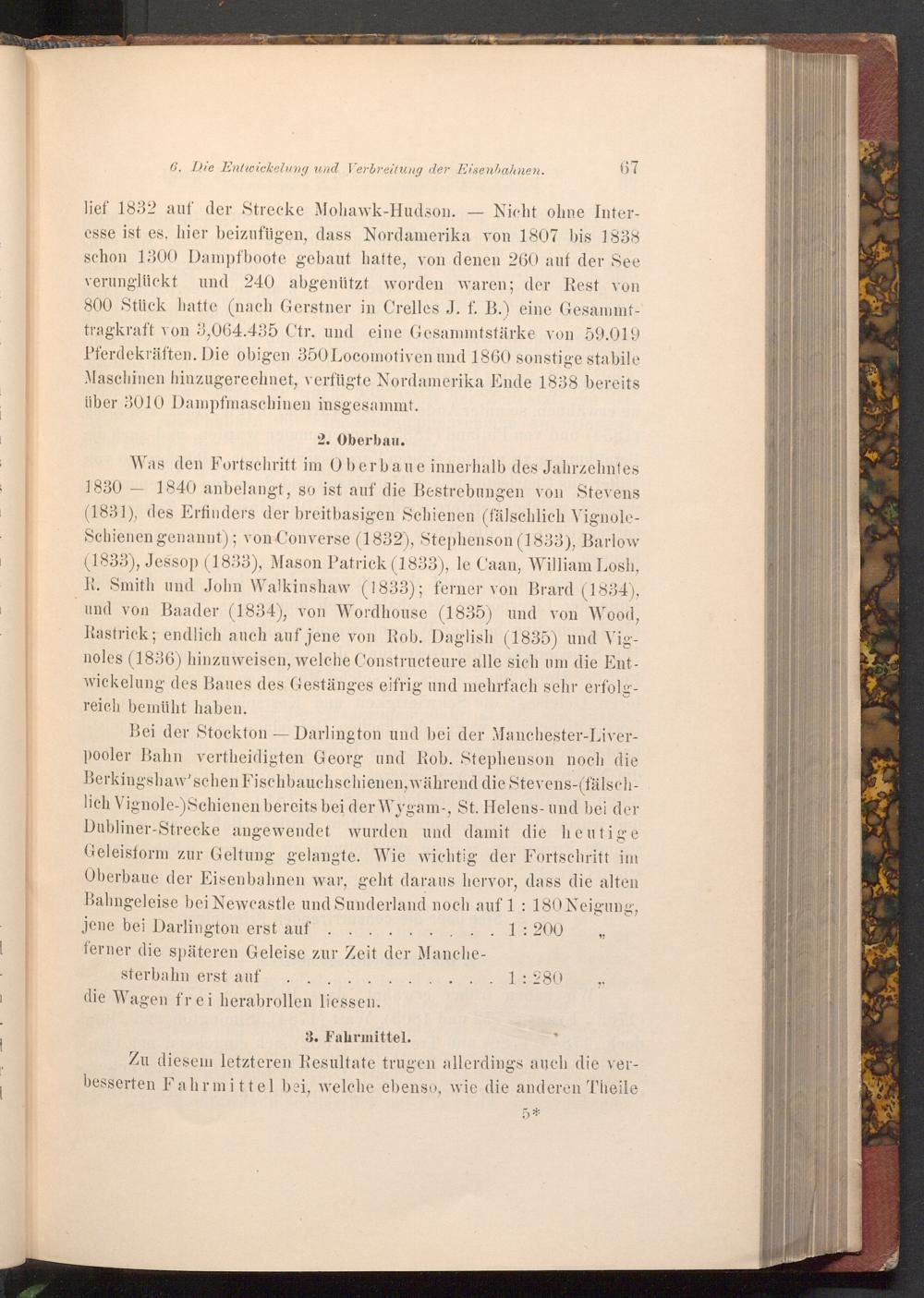 Was den Fortschritt im Oberbaue innerhalb des Jahrzehntes 1830-1840 anbelangt, so ist auf die Bestrebungen von Stevens ( 1831), des Erfinders der breitbasigen Schienen( fälschlich VignoleSchienen genannt); von Converse( 1832), Stephenson( 1833), Barlow ( 1833), Jessop( 1833), Mason Patrick( 1833), le Caan, William Losh, R. Smith und John Walkinshaw( 1833); ferner von Brard( 1834), und von Baader( 1834), von Wordhouse( 1835) und von Wood, Rastrick; endlich auch auf jene von Rob. Daglish( 1835) und Vignoles( 1836) hinzuweisen, welche Constructeure alle sich um die Entwickelung des Baues des Gestänges eifrig und mehrfach sehr erfolgreich bemüht haben.