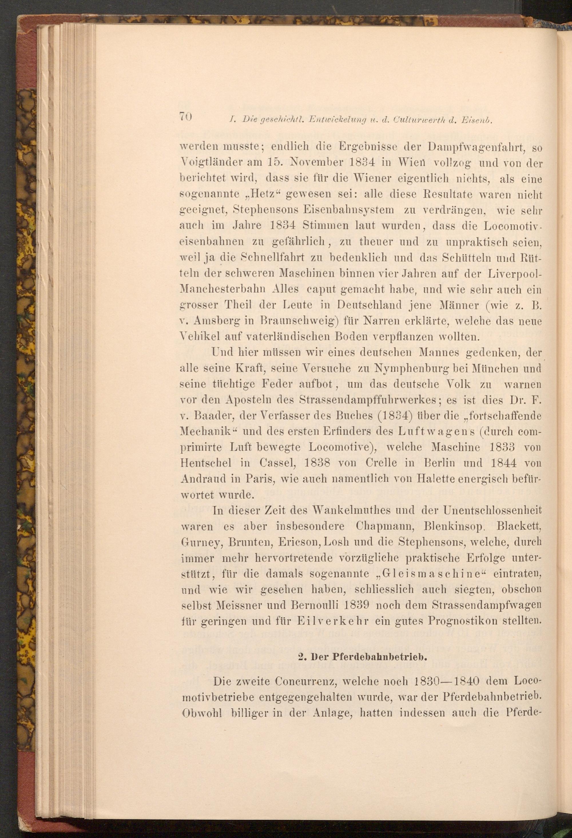 Die zweite Concurrenz, welche noch 1830-1840 dem Locomotivbetriebe entgegengehalten wurde, war der Pferdebahnbetrieb. Obwohl billiger in der Anlage, hatten indessen auch die Pferde