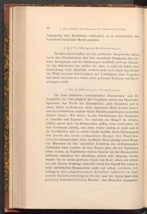 Die Bauwissenschaften wie das ausübende Baugewerbe haben durch den Eisenbahnbau eine fast unendliche Fundgrube theoretischer Anregungen und der Erfahrungen erschürft, weil der Charakter des Bahnbaues ein solcher ist, dass er nicht nur durch seine Erstreckung, seine Quantität, sondern mehr noch durch den Entfall der Wahl zwischen Schwierigkeit und Leichtigkeit beim Vorgehen und durch das Eintreten früher nicht gekannter Kriterien und Beobachtungen wirkt.