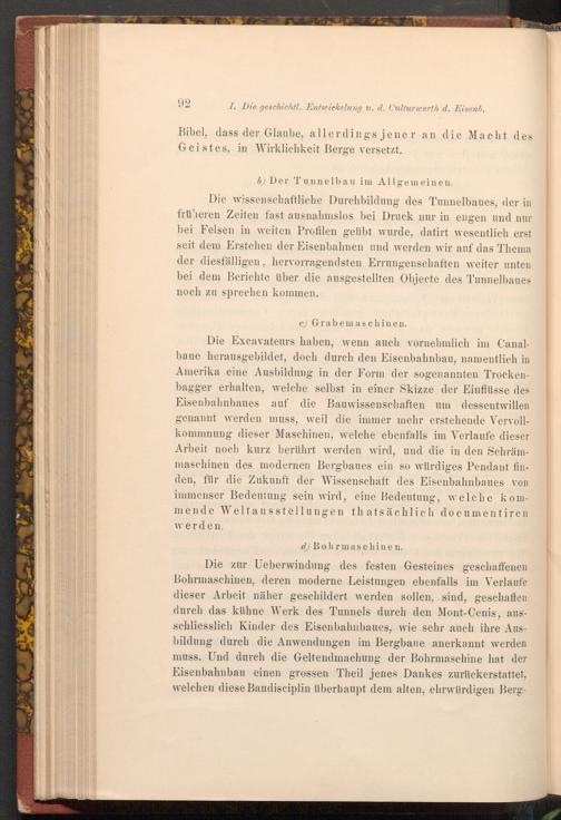 Die wissenschaftliche Durchbildung des Tunnelbaues, der in früheren Zeiten fast ausnahmslos bei Druck nur in engen und nur bei Felsen in weiten Profilen geübt wurde, datirt wesentlich erst seit dem Erstehen der Eisenbahnen und werden wir auf das Thema der diesfälligen, hervorragendsten Errungenschaften weiter unten bei dem Berichte über die ausgestellten Objecte des Tunnelbaues noch zu sprechen kommen.