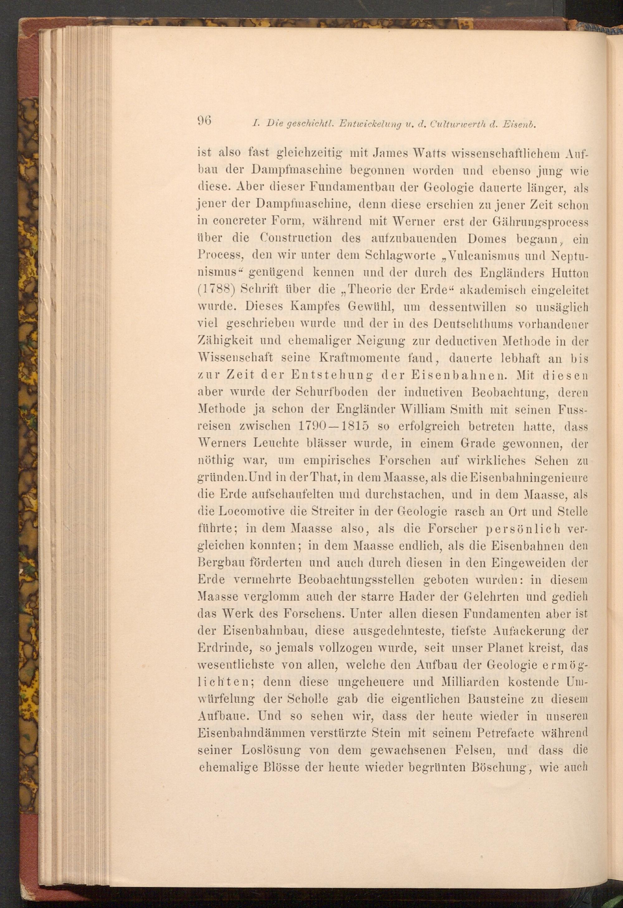 I. Die geschichtl. Entwickelung u. d. Culturwerth d. Eisenb. ist also fast gleichzeitig mit James Watts wissenschaftlichem Aufbau der Dampfmaschine begonnen worden und ebenso jung wie diese. Aber dieser Fundamentbau der Geologie dauerte länger, als jener der Dampfmaschine, denn diese erschien zu jener Zeit schon in concreter Form, während mit Werner erst der Gährungsprocess über die Construction des aufzubauenden Domes begann, ein Process, den wir unter dem Schlagworte, Vulcanismus und Neptunismus“ genügend kennen und der durch des Engländers Hutton ( 1788) Schrift über die ,, Theorie der Erde" akademisch eingeleitet wurde. Dieses Kampfes Gewühl, um dessentwillen so unsäglich viel geschrieben wurde und der in des Deutschthums vorhandener Zähigkeit und ehemaliger Neigung zur deductiven Methode in der Wissenschaft seine Kraftmomente fand, dauerte lebhaft an bis zur Zeit der Entstehung der Eisenbahnen. Mit diesen aber wurde der Schurfboden der inductiven Beobachtung, deren Methode ja schon der Engländer William Smith mit seinen Fussreisen zwischen 1790-1815 so erfolgreich betreten hatte, dass Werners Leuchte blässer wurde, in einem Grade gewonnen, der nöthig war, um empirisches Forschen auf wirkliches Sehen zu gründen. Und in der That, in dem Maasse, als die Eisenbahningenieure die Erde aufschaufelten und durchstachen, und in dem Maasse, als die Locomotive die Streiter in der Geologie rasch an Ort und Stelle führte; in dem Maasse also, als die Forscher persönlich vergleichen konnten; in dem Maasse endlich, als die Eisenbahnen den Bergbau förderten und auch durch diesen in den Eingeweiden der Erde vermehrte Beobachtungsstellen geboten wurden: in diesem Maasse verglomm auch der starre Hader der Gelehrten und gedieh das Werk des Forschens. Unter allen diesen Fundamenten aber ist der Eisenbahnbau, diese ausgedehnteste, tiefste Aufackerung der Erdrinde, so jemals vollzogen wurde, seit unser Planet kreist, das wesentlichste von allen, welche den Aufbau der Geologie ermöglichten; denn diese ungeheuere und Milliarden kostende Umwürfelung der Scholle gab die eigentlichen Bausteine zu diesem Aufbaue. Und so sehen wir, dass der heute wieder in unseren Eisenbahndämmen verstürzte Stein mit seinem Petrefacte während seiner Loslösung von dem gewachsenen Felsen, und dass die ehemalige Blösse der heute wieder begrünten Böschung, wie auch