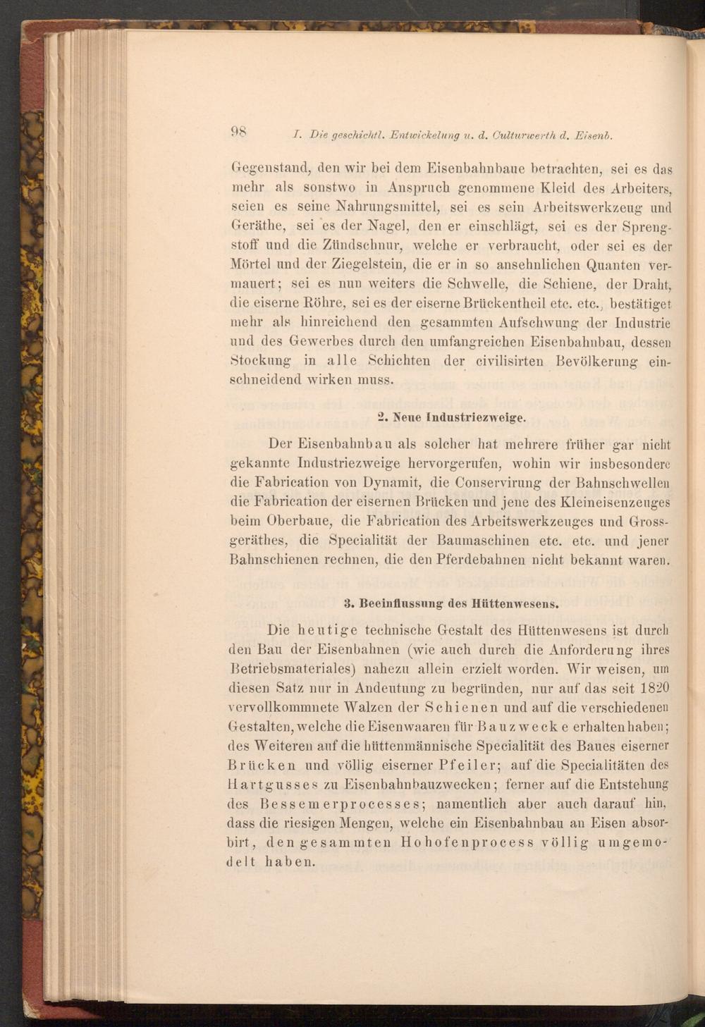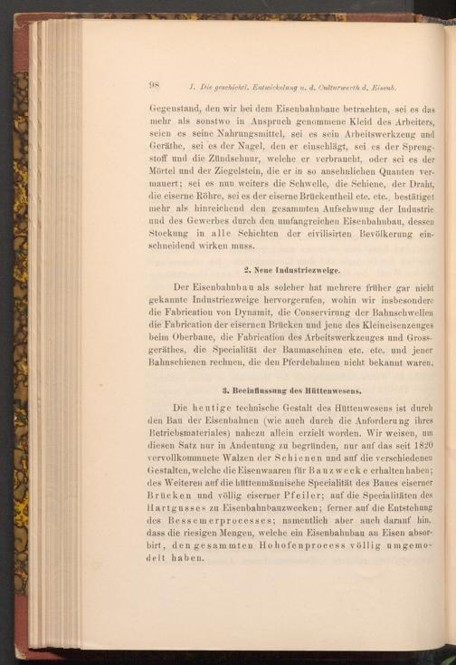 Die heutige technische Gestalt des Hüttenwesens ist durch den Bau der Eisenbahnen( wie auch durch die Anforderung ihres Betriebsmateriales) nahezu allein erzielt worden. Wir weisen, um diesen Satz nur in Andeutung zu begründen, nur auf das seit 1820 vervollkommnete Walzen der Schienen und auf die verschiedenen Gestalten, welche die Eisenwaaren für Bauzwecke erhalten haben; des Weiteren auf die hüttenmännische Specialität des Baues eiserner Brücken und völlig eiserner Pfeiler; auf die Specialitäten des Hartgusses zu Eisenbahnbauzwecken; ferner auf die Entstehung des Bessemerprocesses; namentlich aber auch darauf hin, dass die riesigen Mengen, welche ein Eisenbahnbau an Eisen absorbirt, den gesammten Hohofenprocess völlig umgemodelt haben.
