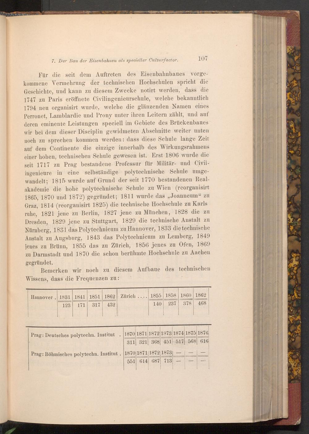 Für die seit dem Auftreten des Eisenbahnbaues vorgekommene Vermehrung der technischen Hochschulen spricht die Geschichte, und kann zu diesem Zwecke notirt werden, dass die 1747 zu Paris eröffnete Civilingenieurschule, welche bekanntlich 1794 neu organisirt wurde, welche die glänzenden Namen eines Perronet, Lamblardie und Prony unter ihren Leitern zählt, und auf deren eminente Leistungen speciell im Gebiete des Brückenbaues wir bei dem dieser Disciplin gewidmeten Abschnitte weiter unten noch zu sprechen kommen werden: dass diese Schule lange Zeit auf dem Continente die einzige innerhalb des Wirkungsrahmens einer hohen, technischen Schule gewesen ist. Erst 1806 wurde die seit 1717 zu Prag bestandene Professur für Militär- und Civilingenieure in eine selbständige polytechnische Schule umgewandelt; 1815 wurde auf Grund der seit 1770 bestandenen Realakademie die hohe polytechnische Schule zu Wien( reorganisirt 1865, 1870 und 1872) gegründet; 1811 wurde das„, Joanneum" zu Graz, 1814( reorganisirt 1825) die technische Hochschule zu Karls ruhe, 1821 jene zu Berlin, 1827 jene zu München, 1828 die zu Dresden, 1829 jene zu Stuttgart, 1829 die technische Anstalt zu Nürnberg, 1831 das Polytechnicum zu Hannover, 1833 die technische Anstalt zu Augsburg, 1843 das Polytechnicum zu Lemberg, 1849 jenes zu Brünn, 1855 das zu Zürich, 1856 jenes zu Ofen, 1869 zu Darmstadt und 1870 die schon berühmte Hochschule zu Aachen gegründet.