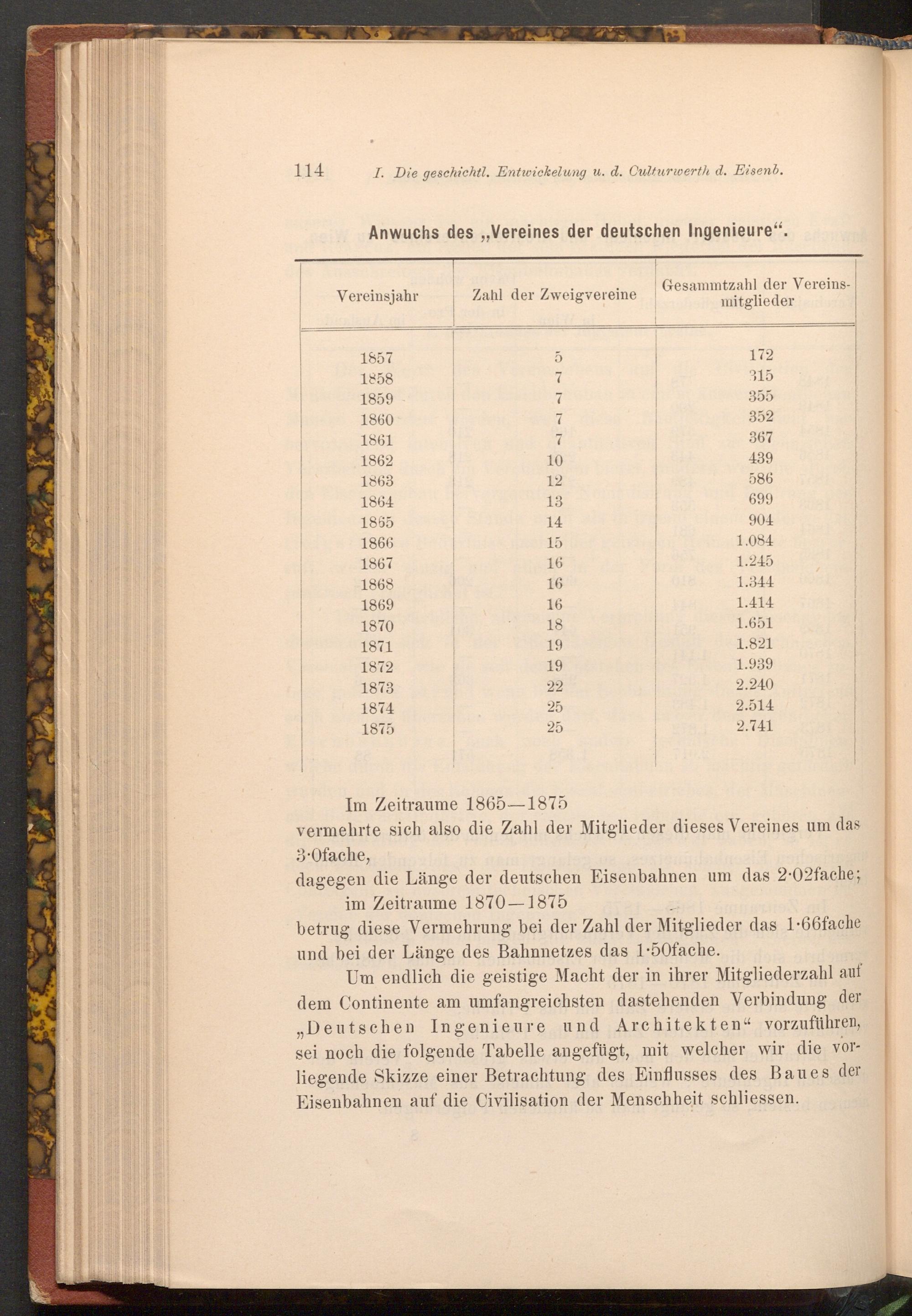 Um endlich die geistige Macht der in ihrer Mitgliederzahl auf dem Continente am umfangreichsten dastehenden Verbindung der ,, Deutschen Ingenieure und Architekten" vorzuführen, sei noch die folgende Tabelle angefügt, mit welcher wir die vorliegende Skizze einer Betrachtung des Einflusses des Baues der Eisenbahnen auf die Civilisation der Menschheit schliessen.