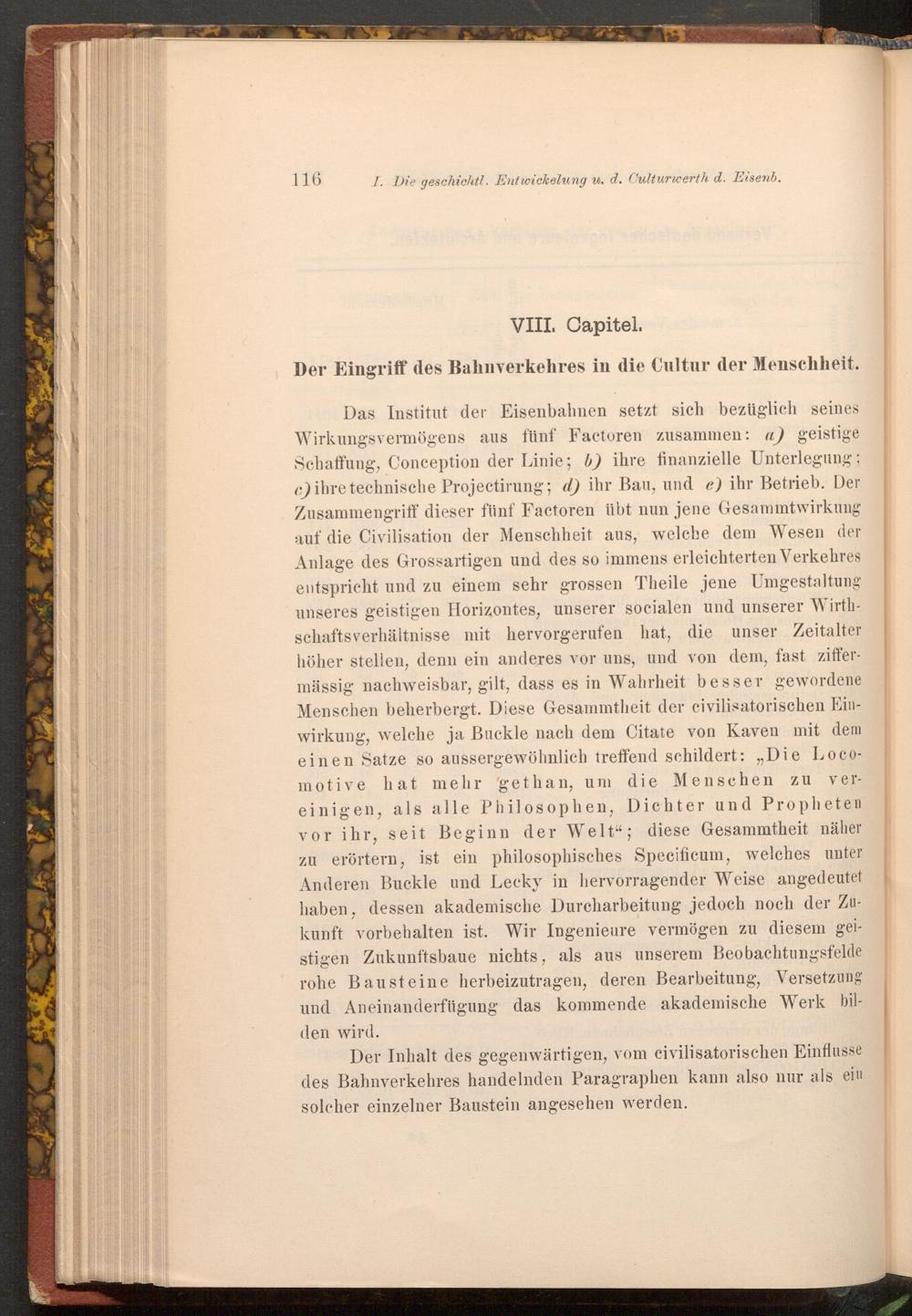 Das Institut der Eisenbahnen setzt sich bezüglich seines Wirkungsvermögens aus fünf Factoren zusammen: a) geistige Schaffung, Conception der Linie; b) ihre finanzielle Unterlegung; c) ihre technische Projectirung; d) ihr Bau, und e) ihr Betrieb. Der Zusammengriff dieser fünf Factoren übt nun jene Gesammtwirkung auf die Civilisation der Menschheit aus, welche dem Wesen der Anlage des Grossartigen und des so immens erleichterten Verkehres entspricht und zu einem sehr grossen Theile jene Umgestaltung unseres geistigen Horizontes, unserer socialen und unserer Wirthschaftsverhältnisse mit hervorgerufen hat, die unser Zeitalter höher stellen, denn ein anderes vor uns, und von dem, fast ziffermässig nachweisbar, gilt, dass es in Wahrheit besser gewordene Menschen beherbergt. Diese Gesammtheit der civilisatorischen Einwirkung, welche ja Buckle nach dem Citate von Kaven mit dem einen Satze so aussergewöhnlich treffend schildert:„ Die Locomotive hat mehr gethan, um die Menschen zu einigen, als alle Philosophen, Dichter und Propheten vor ihr, seit Beginn der Welt"; diese Gesammtheit näher zu erörtern, ist ein philosophisches Specificum, welches unter Anderen Buckle und Lecky in hervorragender Weise angedeutet haben, dessen akademische Durcharbeitung jedoch noch der Zukunft vorbehalten ist. Wir Ingenieure vermögen zu diesem geistigen Zukunftsbaue nichts, als aus unserem Beobachtungsfelde rohe Bausteine herbeizutragen, deren Bearbeitung, Versetzung und Aneinanderfügung das kommende akademische Werk bilden wird.