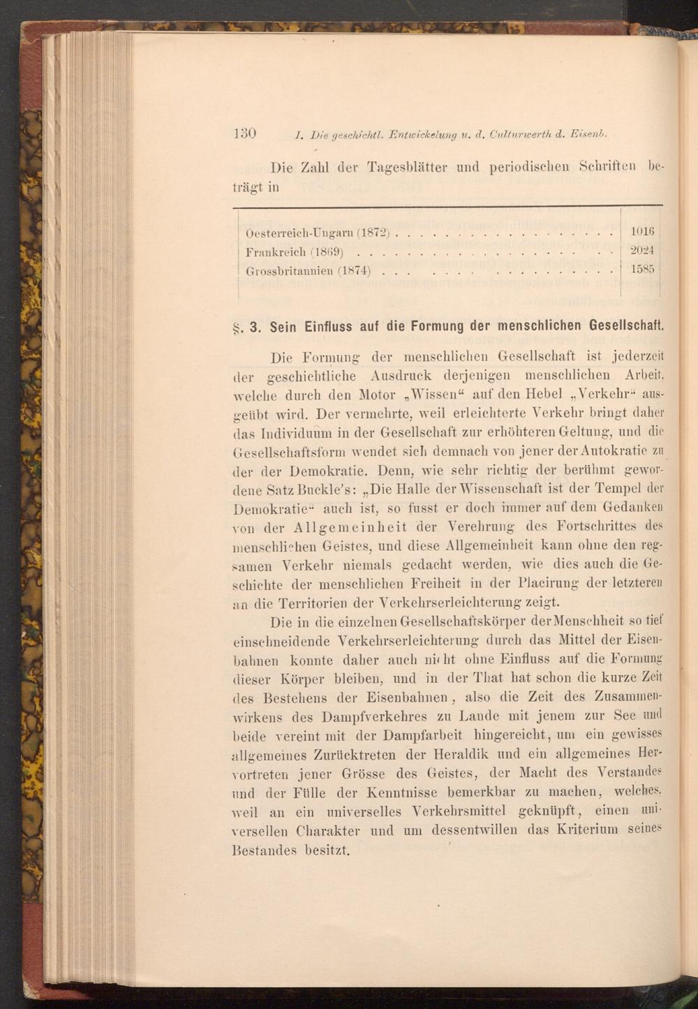 Die Formung der menschlichen Gesellschaft ist jederzeit der geschichtliche Ausdruck derjenigen menschlichen Arbeit, welche durch den Motor, Wissen" auf den Hebel„ Verkehr" ausgeübt wird. Der vermehrte, weil erleichterte Verkehr bringt daher das Individuum in der Gesellschaft zur erhöhteren Geltung, und die Gesellschaftsform wendet sich demnach von jener der Autokratie zu der der Demokratie. Denn, wie sehr richtig der berühmt gewordene Satz Buckle's:„ Die Halle der Wissenschaft ist der Tempel der Demokratie" auch ist, so fusst er doch immer auf dem Gedanken von der Allgemeinheit der Verehrung des Fortschrittes des menschlichen Geistes, und diese Allgemeinheit kann ohne den regsamen Verkehr niemals gedacht werden, wie dies auch die Geschichte der menschlichen Freiheit in der Placirung der letzteren an die Territorien der Verkehrserleichterung zeigt.