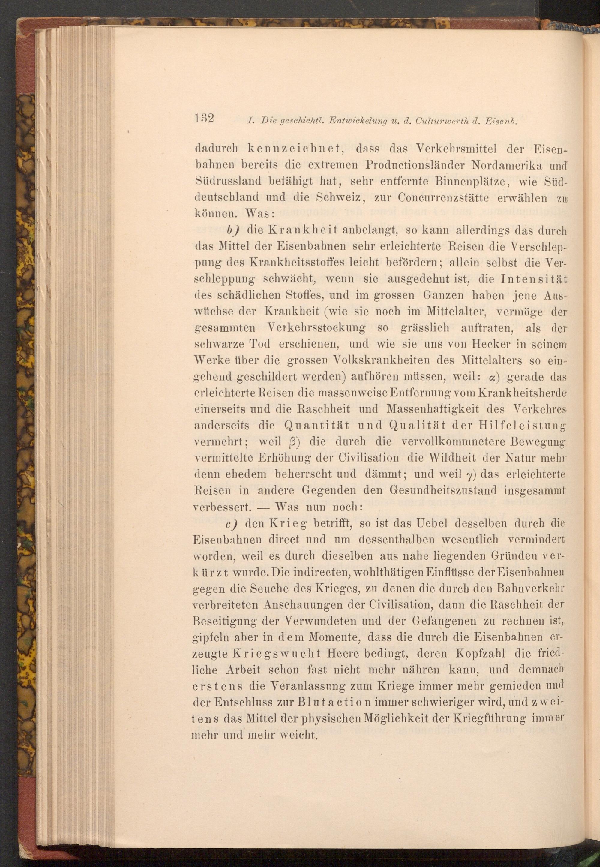 b) die Krankheit anbelangt, so kann allerdings das durch das Mittel der Eisenbahnen sehr erleichterte Reisen die Verschleppung des Krankheitsstoffes leicht befördern; allein selbst die Verschleppung schwächt, wenn sie ausgedehnt ist, die Intensität des schädlichen Stoffes, und im grossen Ganzen haben jene Auswüchse der Krankheit( wie sie noch im Mittelalter, vermöge der gesammten Verkehrsstockung so grässlich auftraten, als der schwarze Tod erschienen, und wie sie uns von Hecker in seinem Werke über die grossen Volkskrankheiten des Mittelalters so eingehend geschildert werden) aufhören müssen, weil: a) gerade das erleichterte Reisen die massenweise Entfernung vom Krankheitsherde einerseits und die Raschheit und Massenhaftigkeit des Verkehres anderseits die Quantität und Qualität der Hilfeleistung vermehrt; weil p) die durch die vervollkommnetere Bewegung vermittelte Erhöhung der Civilisation die Wildheit der Natur mehr denn ehedem beherrscht und dämmt; und weil y) das erleichterte Reisen in andere Gegenden den Gesundheitszustand insgesammt verbessert. Was nun noch: