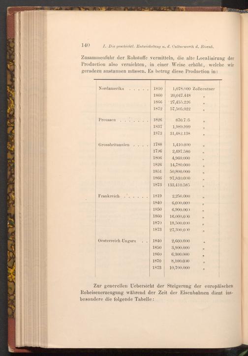 I. Die geschichtl. Entwickelung u. d. Culturwerth d. Eisenb. Zusammenfuhr der Rohstoffe vermitteln, die alte Localisirung der Production also vernichten, in einer Weise erhöht, welche wir geradezu anstaunen müssen. Es betrug diese Production in: