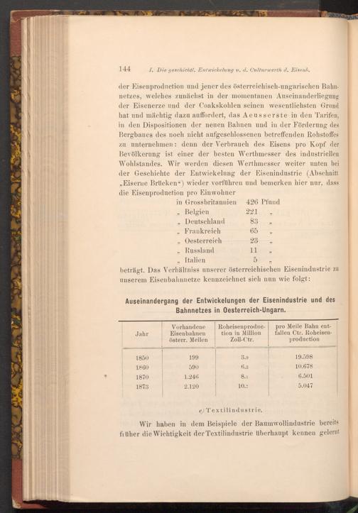 I. Die geschichtl. Entwickelung u. d. Culturwerth d. Eisenb. der Eisenproduction und jener des österreichisch- ungarischen Bahnnetzes, welches zunächst in der momentanen Auseinanderliegung der Eisenerze und der Coakskohlen seinen wesentlichsten Grund hat und mächtig dazu auffordert, das Aeusserste in den Tarifen, in den Dispositionen der neuen Bahnen und in der Förderung des Bergbaues des noch nicht aufgeschlossenen betreffenden Rohstoffes zu unternehmen: denn der Verbrauch des Eisens pro Kopf der Bevölkerung ist einer der besten Werthmesser des industriellen Wohlstandes. Wir werden diesen Werthmesser weiter unten bei der Geschichte der Entwickelung der Eisenindustrie( Abschnitt Eiserne Brücken") wieder vorführen und bemerken hier nur, dass die Eisenproduction pro Einwohner