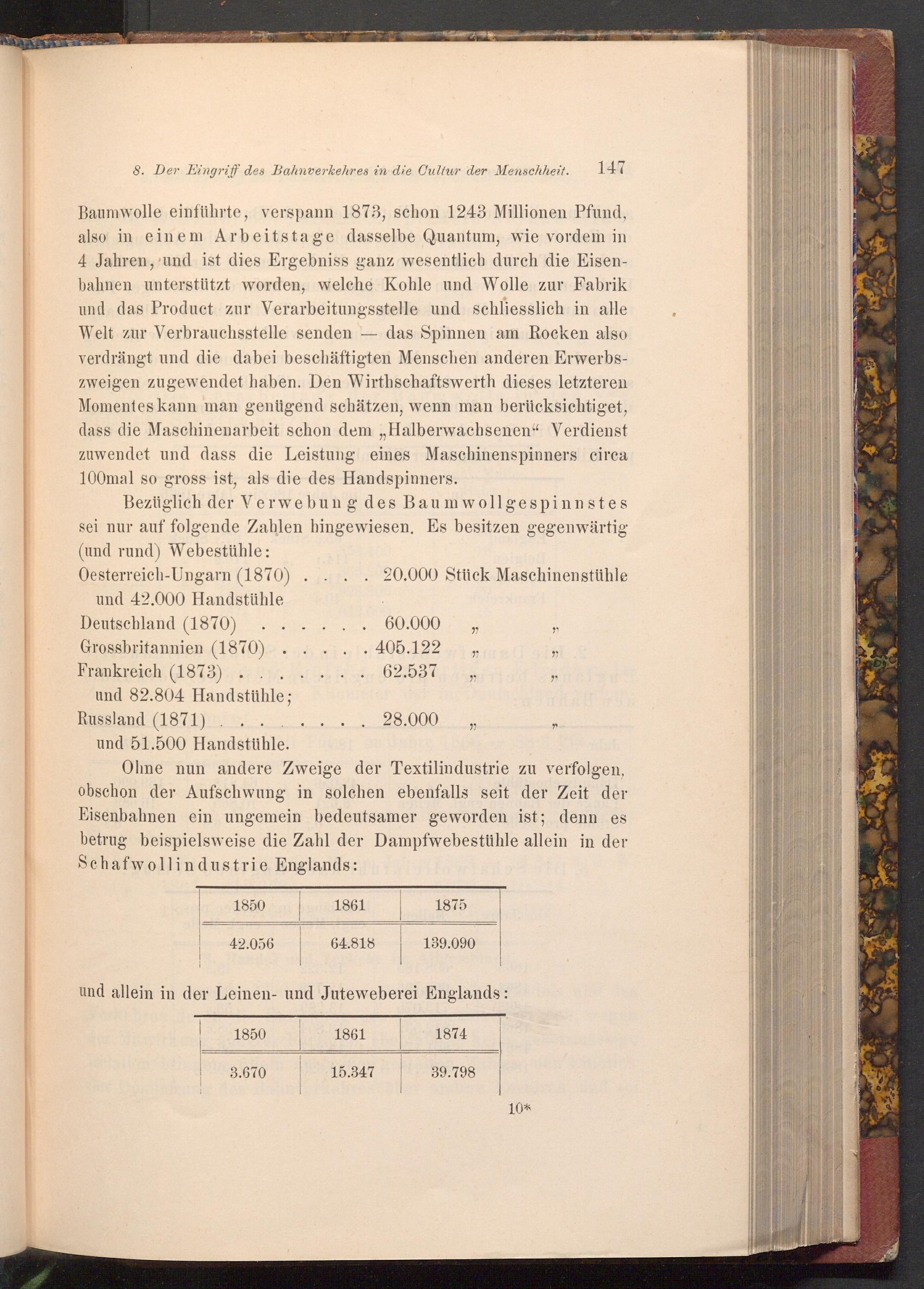 Ohne nun andere Zweige der Textilindustrie zu verfolgen, obschon der Aufschwung in solchen ebenfalls seit der Zeit der Eisenbahnen ein ungemein bedeutsamer geworden ist; denn es betrug beispielsweise die Zahl der Dampfwebestühle allein in der Schafwollindustrie Englands: