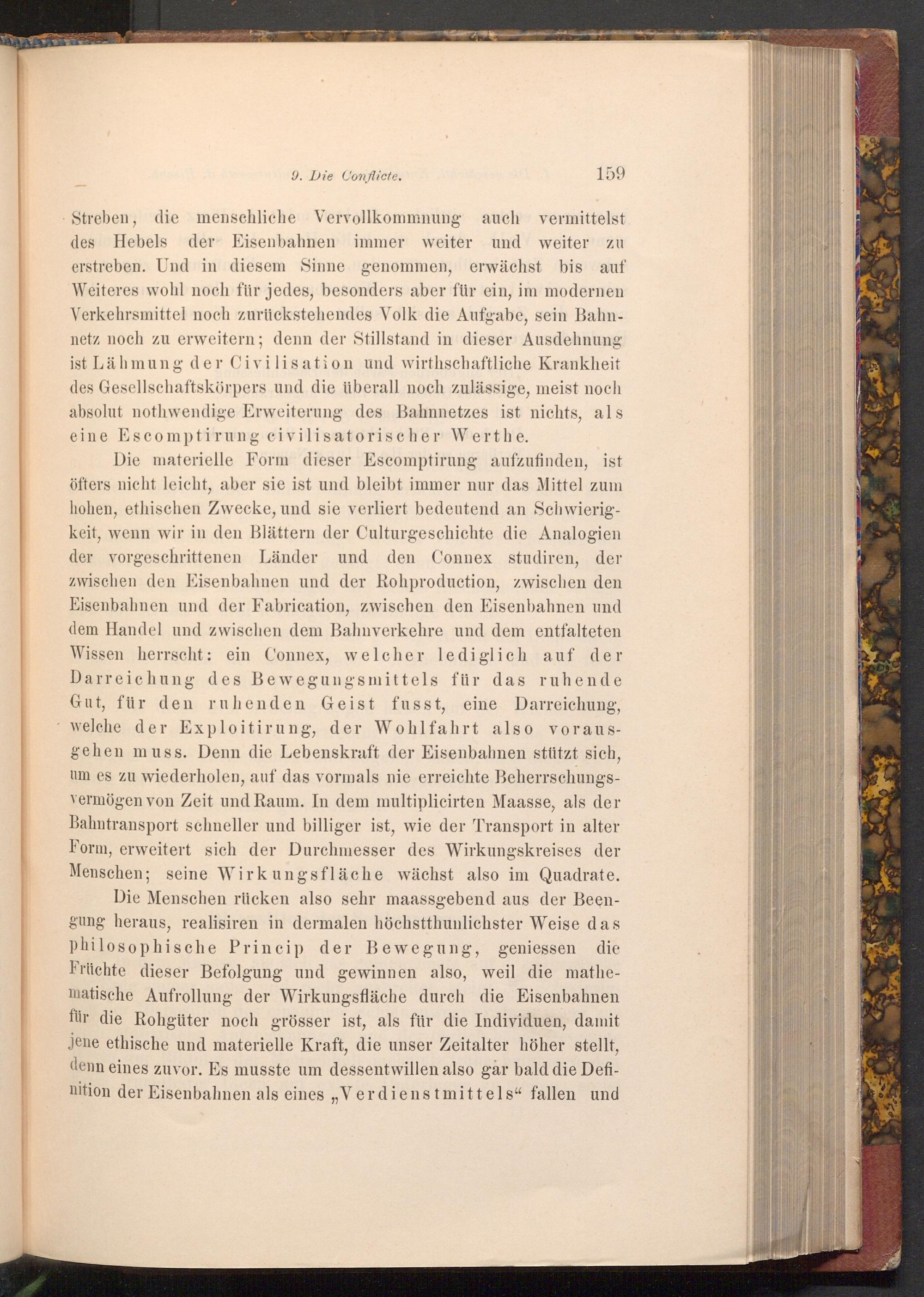 Die Menschen rücken also sehr maassgebend aus der Beengung heraus, realisiren in dermalen höchstthunlichster Weise das philosophische Princip der Bewegung, geniessen die Früchte dieser Befolgung und gewinnen also, weil die mathematische Aufrollung der Wirkungsfläche durch die Eisenbahnen für die Rohgüter noch grösser ist, als für die Individuen, damit jene ethische und materielle Kraft, die unser Zeitalter höher stellt, denn eines zuvor. Es musste um dessentwillen also gar bald die Definition der Eisenbahnen als eines Verdienstmittels" fallen und