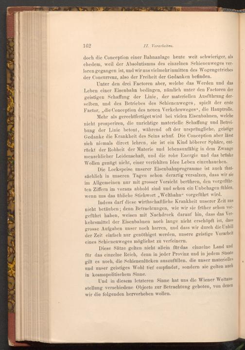 Unter den drei Factoren aber, welche das Werden und das Leben einer Eisenbahn bedingen, nämlich unter den Factoren der geistigen Schaffung der Linie, der materiellen Ausführung derselben, und des Betriebes des Schienenweges, spielt der erste Factor ,,, die Conception des neuen Verkehrsweges", die Hauptrolle.