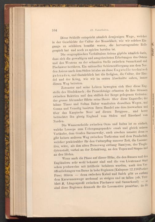 Wenn auch die Pässe auf dieser Höhe, die den Russen und den Engländern sehr wohl bekannt sind und die von Lieutenant Sturt schon probeweise mit Artillerie befahren wurden, nach den Veröffentlichungen von Burns in hohe Regionen( Kalupass 12.198 Pariser Fuss) führen denn zwischen Kabul und Balch gibt es entlang dem Karavanenwege sechsmal zu steigen und zu fallen( cfr. Textblatt B, Längenprofil zwischen Pischawer und Samarkand) sind diese Regionen dennoch für die Locomotive passirbar, da die