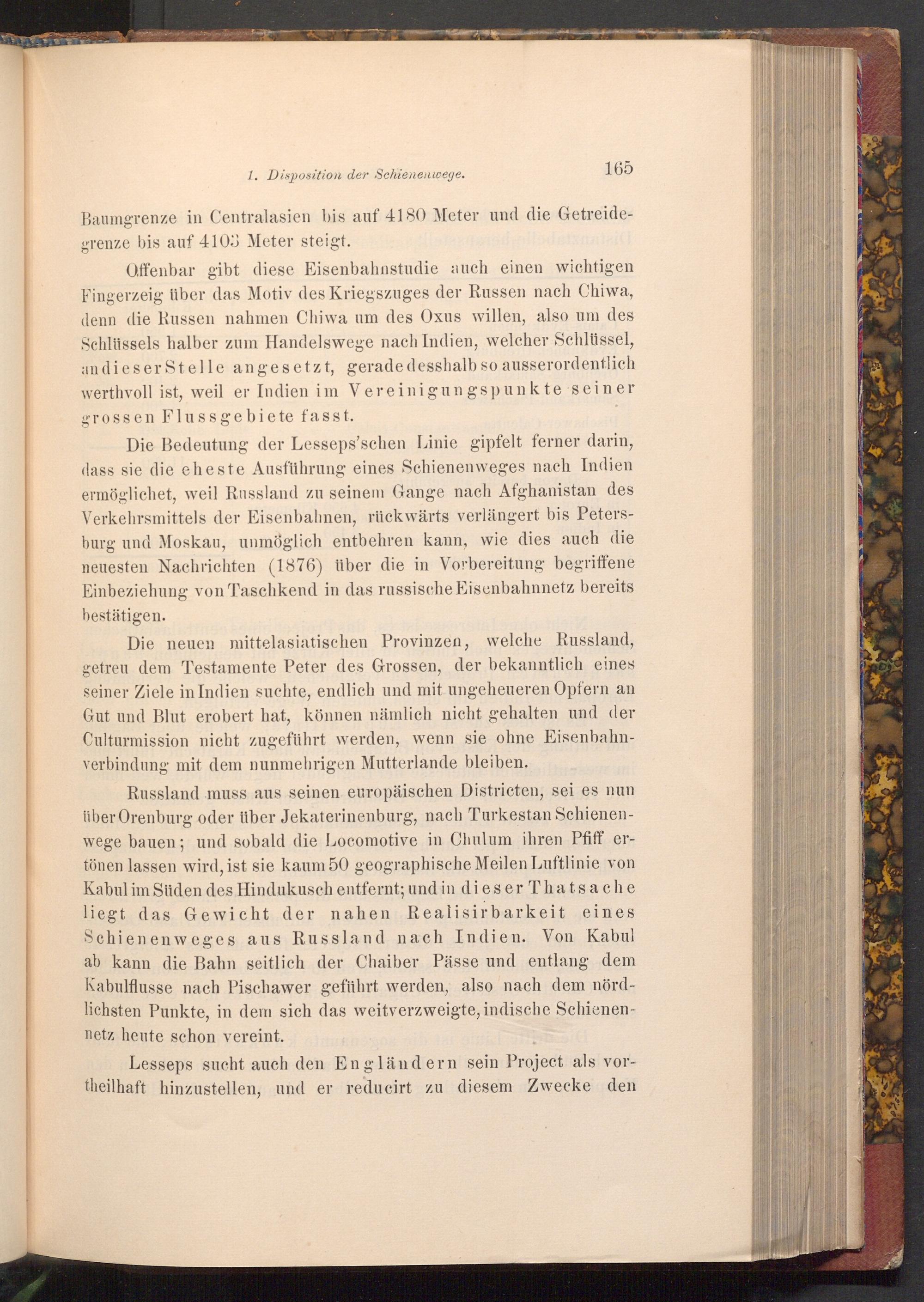 Die neuen mittelasiatischen Provinzen, welche Russland, getreu dem Testamente Peter des Grossen, der bekanntlich eines seiner Ziele in Indien suchte, endlich und mit ungeheueren Opfern an Gut und Blut erobert hat, können nämlich nicht gehalten und der Culturmission nicht zugeführt werden, wenn sie ohne Eisenbahnverbindung mit dem nunmehrigen Mutterlande bleiben.