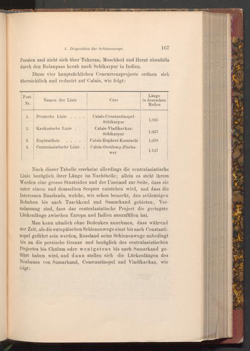 Nach dieser Tabelle erscheint allerdings die centralasiatische Linie bezüglich ihrer Länge im Nachtheile; allein es steht ihrem Werden eine grosse Staatsidee und der Umstand zur Seite, dass sie unter einem und demselben Scepter entstehen wird, und dass die Interessen Russlands, welche, wie schon bemerkt, den schleunigen Bahnbau bis nach Taschkend und Samarkand gebieten, Veranlassung sind, dass das centralasiatische Project die geringste Lückenlänge zwischen Europa und Indien auszufüllen hat.