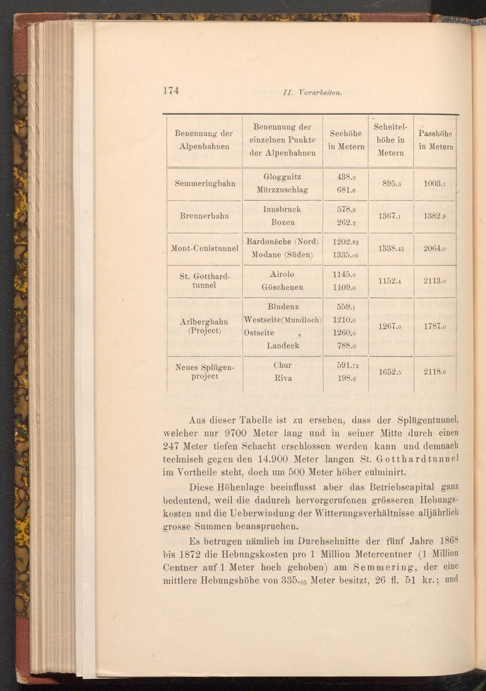 Aus dieser Tabelle ist zu ersehen, dass der Splügentunnel, welcher nur 9700 Meter lang und in seiner Mitte durch einen 247 Meter tiefen Schacht erschlossen werden kann und demnach technisch gegen den 14.900 Meter langen St. Gotthardtunnel im Vortheile steht, doch um 500 Meter höher culminirt.