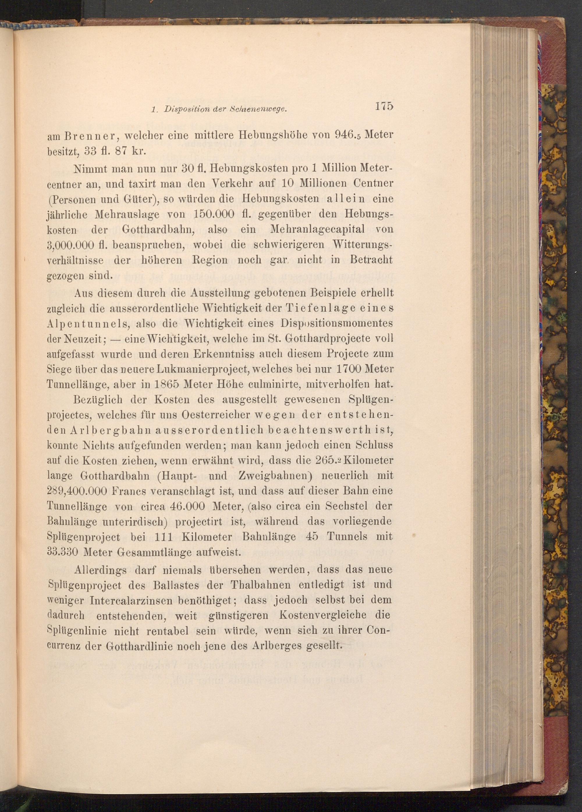 Allerdings darf niemals übersehen werden, dass das neue Splügenproject des Ballastes der Thalbahnen entledigt ist und weniger Intercalarzinsen benöthiget; dass jedoch selbst bei dem dadurch entstehenden, weit günstigeren Kostenvergleiche die Splügenlinie nicht rentabel sein würde, wenn sich zu ihrer Concurrenz der Gotthardlinie noch jene des Arlberges gesellt.