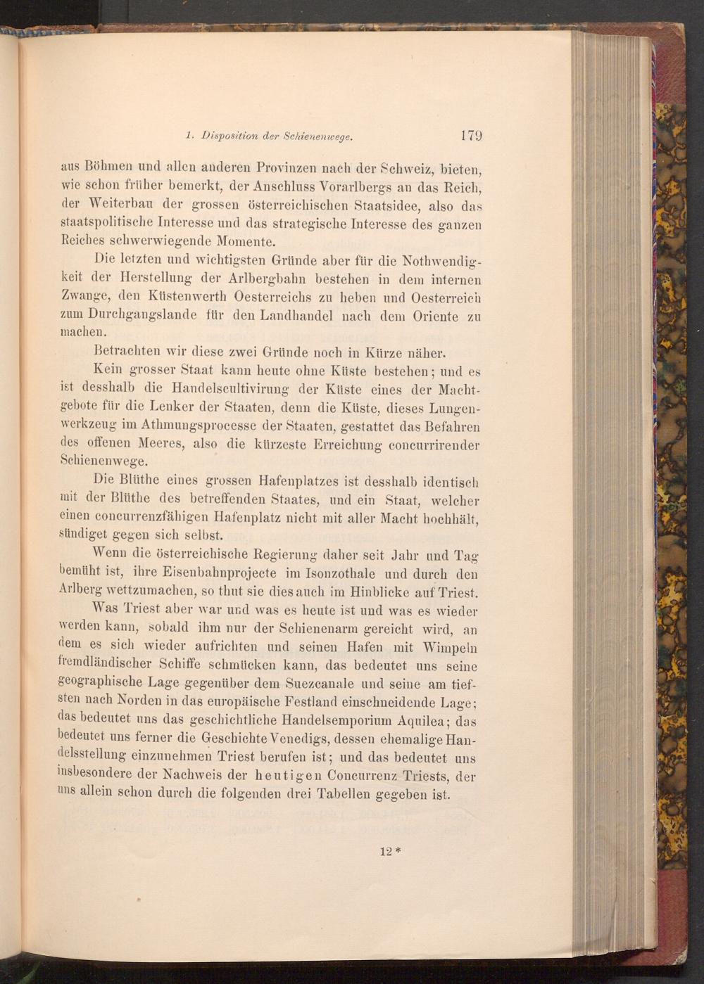 Was Triest aber war und was es heute ist und was es wieder werden kann, sobald ihm nur der Schienenarm gereicht wird, an dem es sich wieder aufrichten und seinen Hafen mit Wimpeln fremdländischer Schiffe schmücken kann, das bedeutet uns seine geographische Lage gegenüber dem Suezcanale und seine am tiefsten nach Norden in das europäische Festland einschneidende Lage; das bedeutet uns das geschichtliche Handelsemporium Aquilea; das bedeutet uns ferner die Geschichte Venedigs, dessen ehemalige Handelsstellung einzunehmen Triest berufen ist; und das bedeutet uns insbesondere der Nachweis der heutigen Concurrenz Triests, der uns allein schon durch die folgenden drei Tabellen gegeben ist.