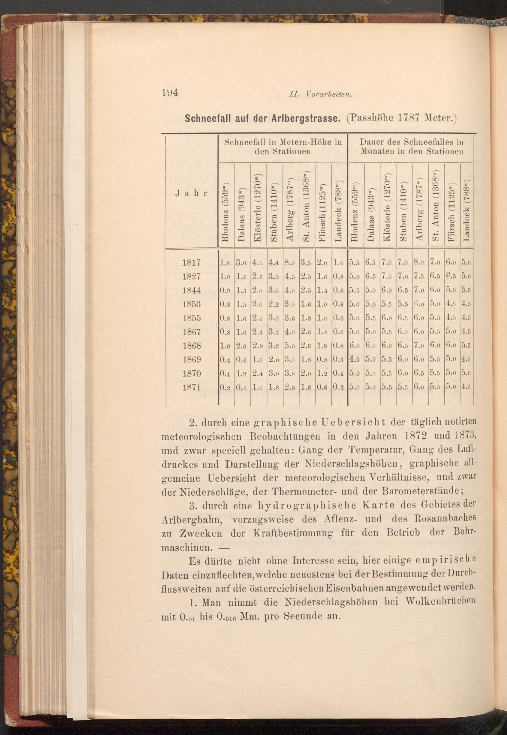 2. durch eine graphische Uebersicht der täglich notirten meteorologischen Beobachtungen in den Jahren 1872 und 1873, und zwar speciell gehalten: Gang der Temperatur, Gang des Luftdruckes und Darstellung der Niederschlagshöhen, graphische allgemeine Uebersicht der meteorologischen Verhältnisse, und zwar der Niederschläge, der Thermometer- und der Barometerstände;