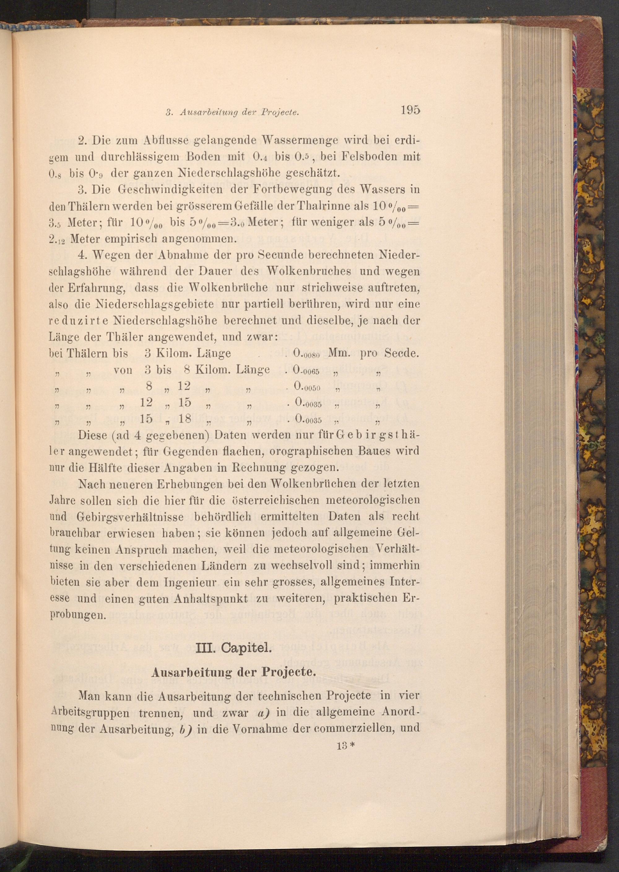2. Die zum Abflusse gelangende Wassermenge wird bei erdigem und durchlässigem Boden mit 0.4 bis 0.5, bei Felsboden mit 0.8 bis 0', der ganzen Niederschlagshöhe geschätzt.