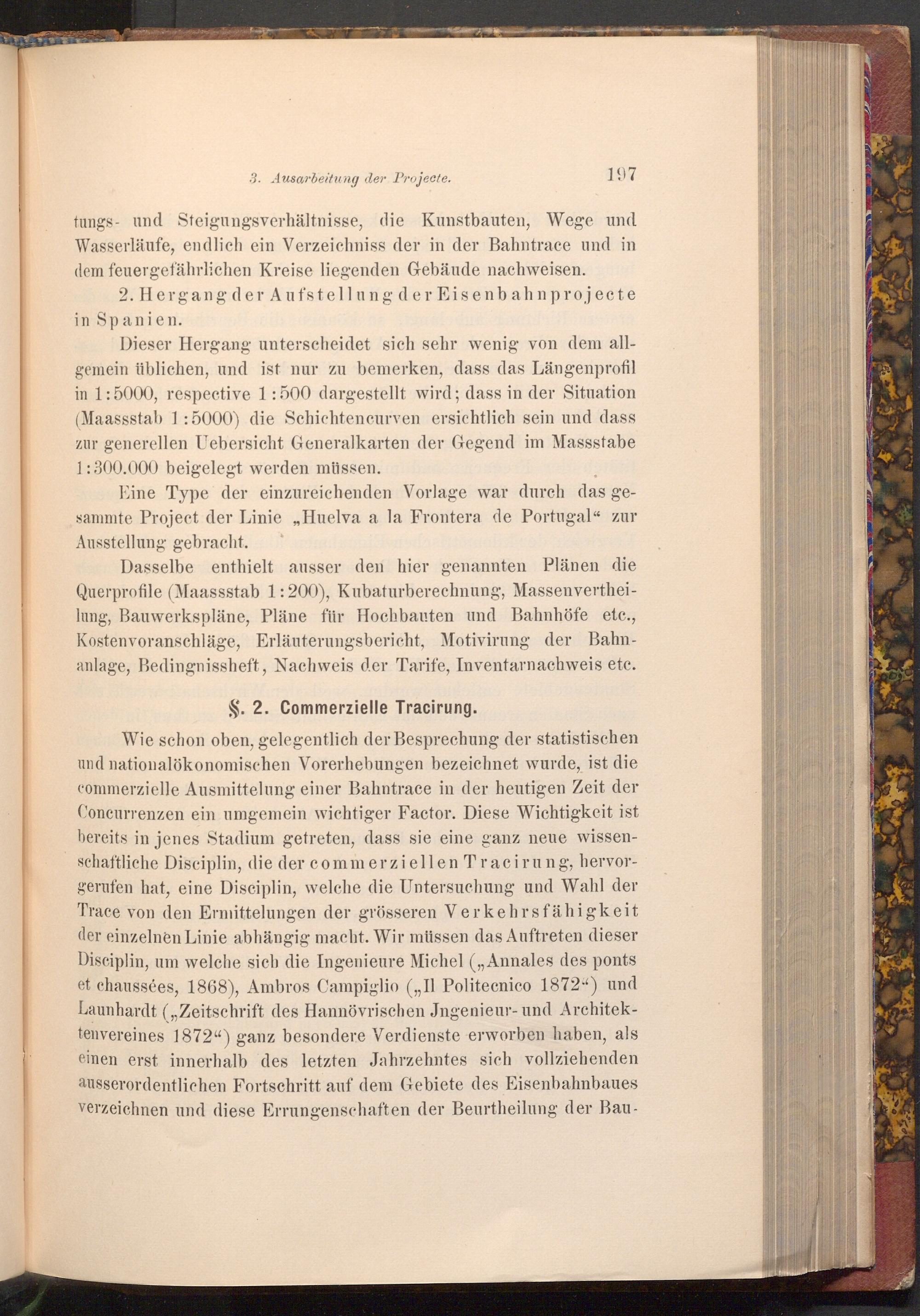 Wie schon oben, gelegentlich der Besprechung der statistischen und nationalökonomischen Vorerhebungen bezeichnet wurde, ist die commerzielle Ausmittelung einer Bahntrace in der heutigen Zeit der Concurrenzen ein umgemein wichtiger Factor. Diese Wichtigkeit ist bereits in jenes Stadium getreten, dass sie eine ganz neue wissenschaftliche Disciplin, die der commerziellen Tracirung, hervorgerufen hat, eine Disciplin, welche die Untersuchung und Wahl der Trace von den Ermittelungen der grösseren Verkehrsfähigkeit der einzelnen Linie abhängig macht. Wir müssen das Auftreten dieser Disciplin, um welche sich die Ingenieure Michel( ,, Annales des ponts et chaussées, 1868), Ambros Campiglio( ,, Il Politecnico 1872") und Launhardt( ,, Zeitschrift des Hannövrischen Jngenieur- und Architektenvereines 1872") ganz besondere Verdienste erworben haben, als einen erst innerhalb des letzten Jahrzehntes sich vollziehenden ausserordentlichen Fortschritt auf dem Gebiete des Eisenbahnbaues verzeichnen und diese Errungenschaften der Beurtheilung der Bau