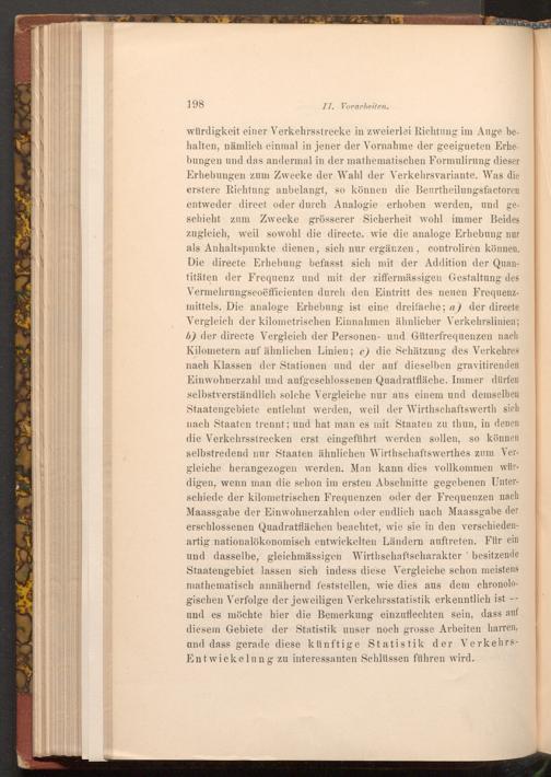 würdigkeit einer Verkehrsstrecke in zweierlei Richtung im Auge behalten, nämlich einmal in jener der Vornahme der geeigneten Erhebungen und das andermal in der mathematischen Formulirung dieser Erhebungen zum Zwecke der Wahl der Verkehrsvariante. Was die erstere Richtung anbelangt, so können die Beurtheilungsfactoren entweder direct oder durch Analogie erhoben werden, und geschieht zum Zwecke grösserer Sicherheit wohl immer Beides zugleich, weil sowohl die directe, wie die analoge Erhebung nur als Anhaltspunkte dienen, sich nur ergänzen, controlirèn können. Die directe Erhebung befasst sich mit der Addition der Quantitäten der Frequenz und mit der ziffermässigen Gestaltung des Vermehrungscoëfficienten durch den Eintritt des neuen Frequenzmittels. Die analoge Erhebung ist eine dreifache; a) der directe Vergleich der kilometrischen Einnahmen ähnlicher Verkehrslinien; b) der directe Vergleich der Personen- und Güterfrequenzen nach Kilometern auf ähnlichen Linien; c) die Schätzung des Verkehres nach Klassen der Stationen und der auf dieselben gravitirenden Einwohnerzahl und aufgeschlossenen Quadratfläche. Immer dürfen selbstverständlich solche Vergleiche nur aus einem und demselben Staatengebiete entlehnt werden, weil der Wirthschaftswerth sich nach Staaten trennt; und hat man es mit Staaten zu thun, in denen die Verkehrsstrecken erst eingeführt werden sollen, so können selbstredend nur Staaten ähnlichen Wirthschaftswerthes zum Vergleiche herangezogen werden. Man kann dies vollkommen würdigen, wenn man die schon im ersten Abschnitte gegebenen Unterschiede der kilometrischen Frequenzen oder der Frequenzen nach Maassgabe der Einwohnerzahlen oder endlich nach Maassgabe der erschlossenen Quadratflächen beachtet, wie sie in den verschiedenartig nationalökonomisch entwickelten Ländern auftreten. Für ein und dasselbe, gleichmässigen Wirthschaftscharakter besitzende Staatengebiet lassen sich indess diese Vergleiche schon meistens mathematisch annähernd feststellen, wie dies aus dem chronologischen Verfolge der jeweiligen Verkehrsstatistik erkenntlich ist und es möchte hier die Bemerkung einzuflechten sein, dass auf diesem Gebiete der Statistik unser noch grosse Arbeiten harren, und dass gerade diese künftige Statistik der VerkehrsEntwickelung zu interessanten Schlüssen führen wird.