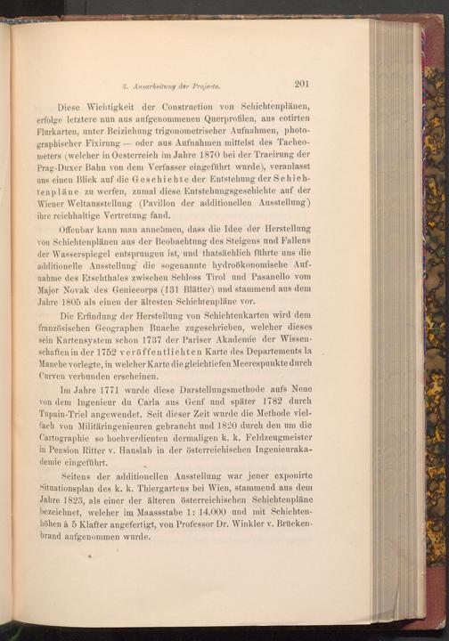Diese Wichtigkeit der Construction von Schichtenplänen, erfolge letztere nun aus aufgenommenen Querprofilen, aus cotirten Flurkarten, unter Beiziehung trigonometrischer Aufnahmen, photographischer Fixirung oder aus Aufnahmen mittelst des Tacheometers( welcher in Oesterreich im Jahre 1870 bei der Tracirung der Prag- Duxer Bahn von dem Verfasser eingeführt wurde), veranlasst uns einen Blick auf die Geschichte der Entstehung der Schichtenpläne zu werfen, zumal diese Entstehungsgeschichte auf der Wiener Weltausstellung( Pavillon der additionellen Ausstellung) ihre reichhaltige Vertretung fand.