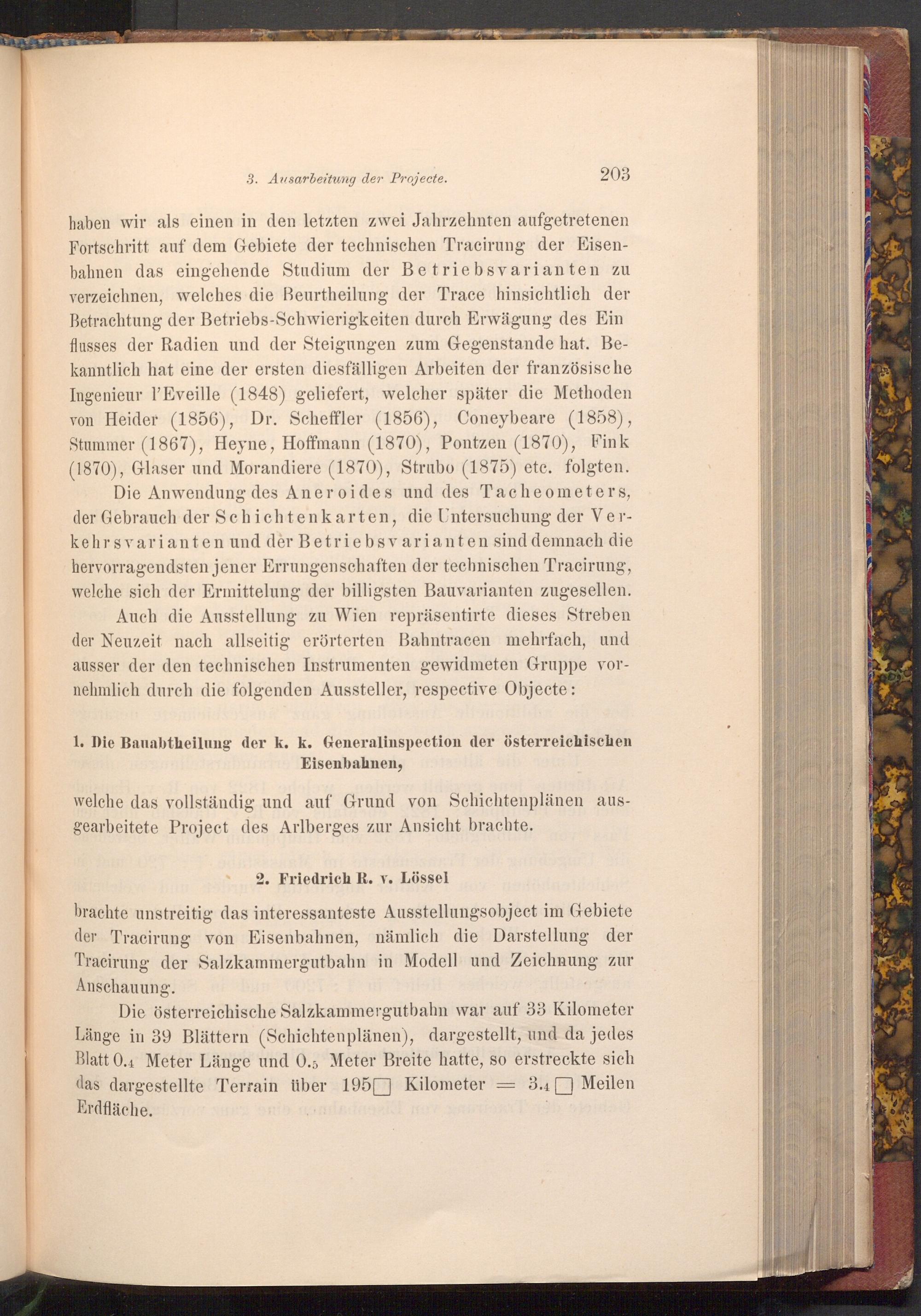 Die österreichische Salzkammergutbahn war auf 33 Kilometer Länge in 39 Blättern( Schichtenplänen), dargestellt, und da jedes Blatt 0.4 Meter Länge und 0.5 Meter Breite hatte, so erstreckte sich das dargestellte Terrain über 195 Kilometer Erdfläche.