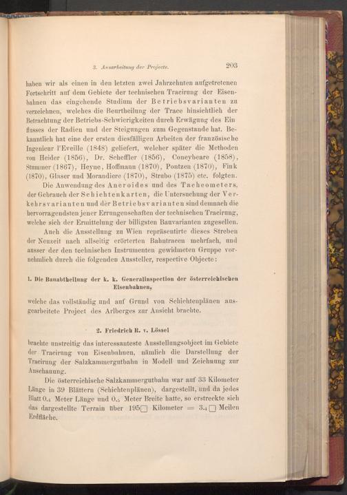 Auch die Ausstellung zu Wien repräsentirte dieses Streben der Neuzeit nach allseitig erörterten Bahntracen mehrfach, und ausser der den technischen Instrumenten gewidmeten Gruppe vornehmlich durch die folgenden Aussteller, respective Objecte:
