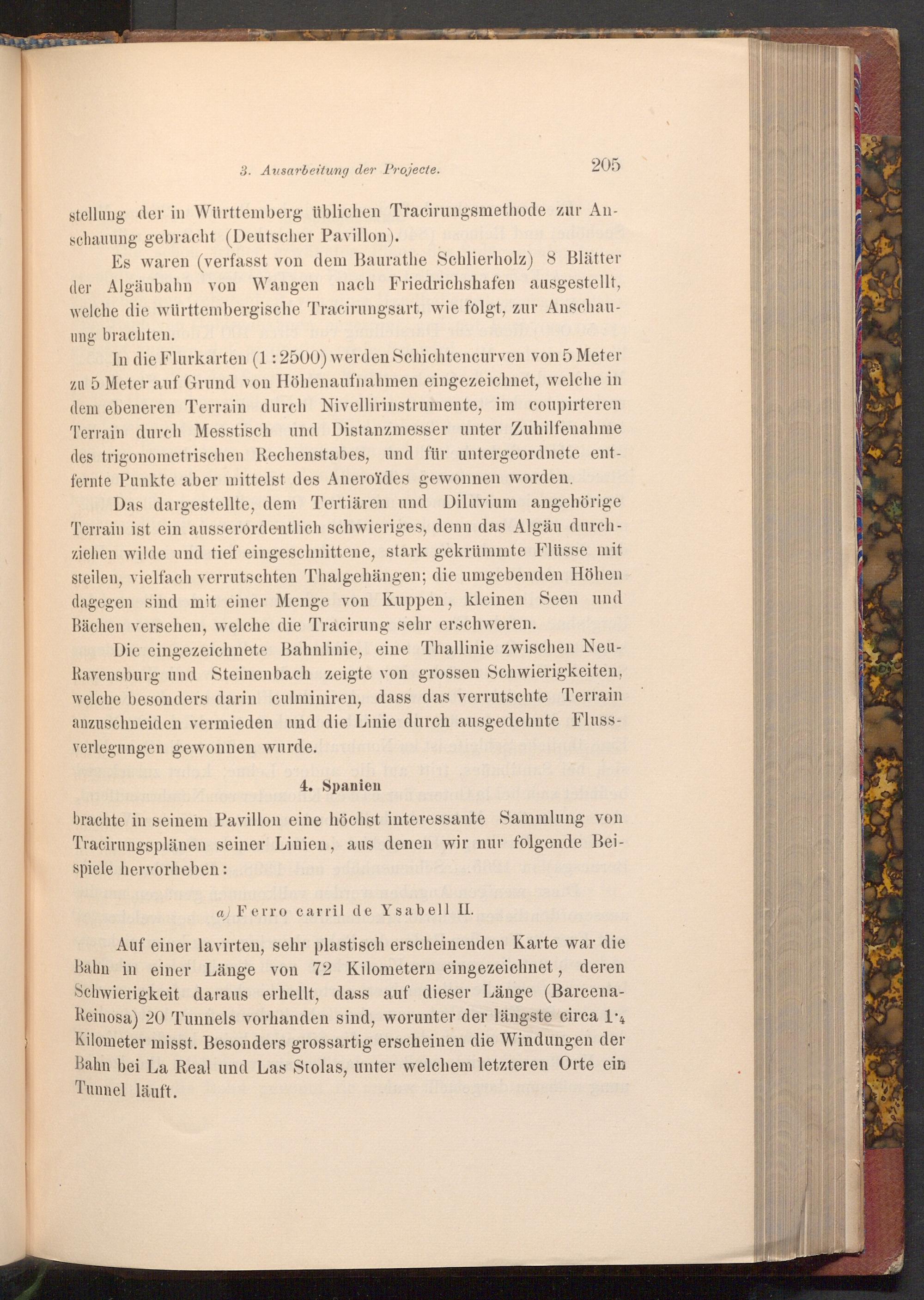 Auf einer lavirten, sehr plastisch erscheinenden Karte war die Bahn in einer Länge von 72 Kilometern eingezeichnet, deren Schwierigkeit daraus erhellt, dass auf dieser Länge( BarcenaReinosa) 20 Tunnels vorhanden sind, worunter der längste circa 1.4 Kilometer misst. Besonders grossartig erscheinen die Windungen der Bahn bei La Real und Las Stolas, unter welchem letzteren Orte ein Tunnel läuft.