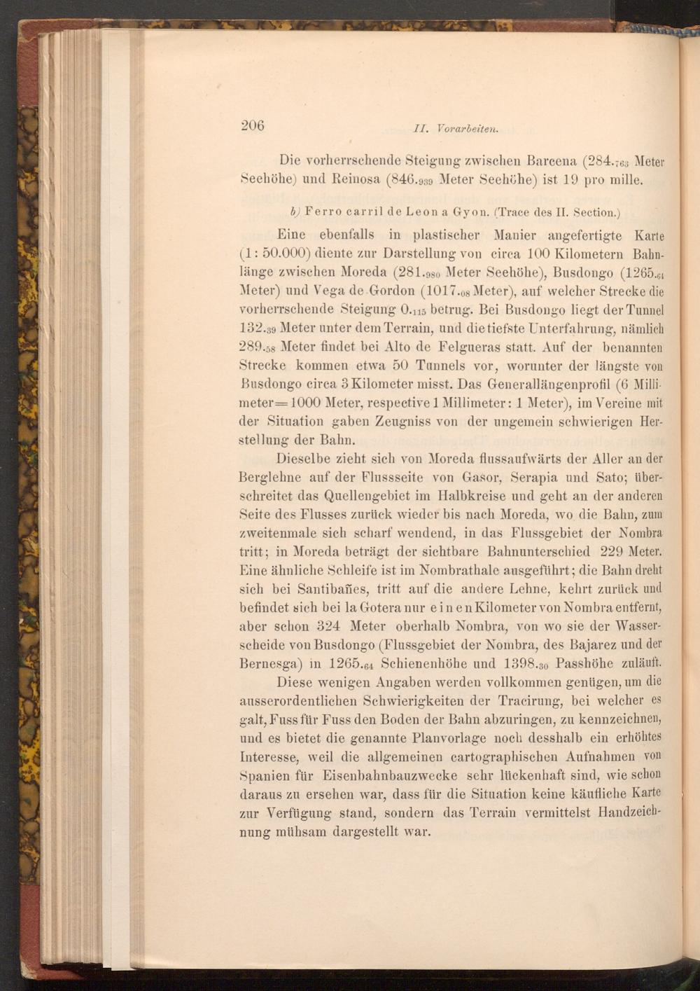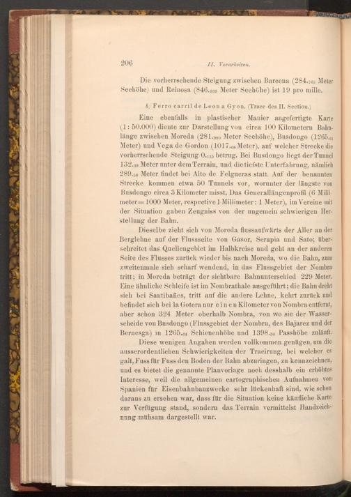 b) Ferro carril de Leon a Gyon.( Trace des II. Section.) Eine ebenfalls in plastischer Manier angefertigte Karte ( 1: 50.000) diente zur Darstellung von circa 100 Kilometern Bahnlänge zwischen Moreda( 281.980 Meter Seehöhe), Busdongo( 1265.64 Meter) und Vega de Gordon( 1017.08 Meter), auf welcher Strecke die vorherrschende Steigung 0.115 betrug. Bei Busdongo liegt der Tunnel 132.39 Meter unter dem Terrain, und die tiefste Unterfahrung, nämlich 289.58 Meter findet bei Alto de Felgueras statt. Auf der benannten Strecke kommen etwa 50 Tunnels vor, worunter der längste von Busdongo circa 3 Kilometer misst. Das Generallängenprofil( 6 Millimeter 1000 Meter, respective 1 Millimeter: 1 Meter), im Vereine mit der Situation gaben Zeugniss von der ungemein schwierigen Herstellung der Bahn.
