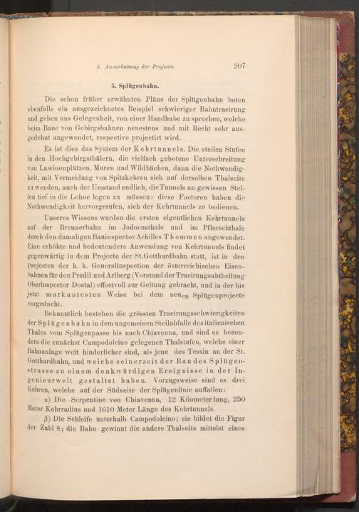 Unseres Wissens wurden die ersten eigentlichen Kehrtunnels auf der Brennerbahn im Jodocusthale und im Pflerschthale durch den damaligen Bauinspector Achilles Thommen angewendet. Eine erhöhte und bedeutendere Anwendung von Kehrtunnels findet gegenwärtig in dem Projecte der St.Gotthardbahn statt, ist in den Projecten der k. k. Generalinspection der österreichischen Eisenbahnen für den Predil und Arlberg( Vorstand der Tracirungsabtheilung Oberinspector Dostal) effectvoll zur Geltung gebracht, und in der bis jetzt markantesten Weise bei dem neuen Splügenprojecte vorgedacht.
