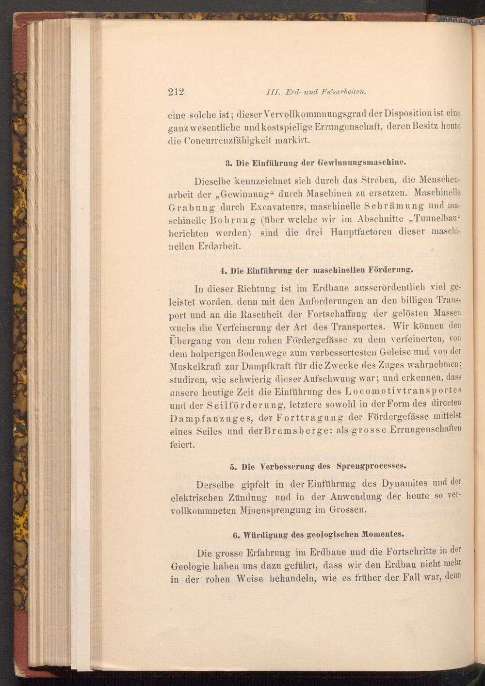Dieselbe kennzeichnet sich durch das Streben, die Menschenarbeit der Gewinnung" durch Maschinen zu ersetzen. Maschinelle Grabung durch Excavateurs, maschinelle Schrämung und maschinelle Bohrung( über welche wir im Abschnitte„ Tunnelbau" berichten werden) sind die drei Hauptfactoren dieser maschinellen Erdarbeit.