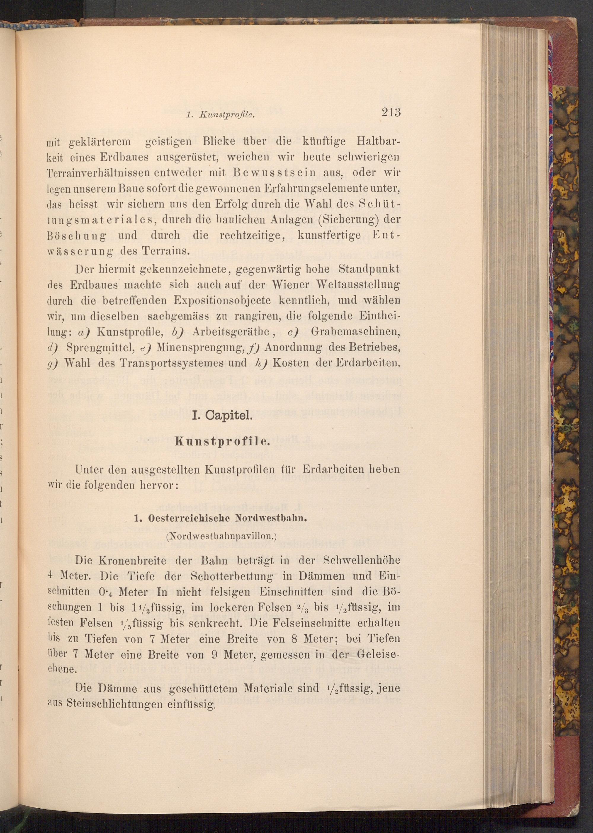 Die Kronenbreite der Bahn beträgt in der Schwellenhöhe 4 Meter. Die Tiefe der Schotterbettung in Dämmen und Einschnitten 04 Meter In nicht felsigen Einschnitten sind die Böschungen 1 bis 11/, füssig, im lockeren Felsen 2/3 bis 1/ 2füssig, im festen Felsen füssig bis senkrecht. Die Felseinschnitte erhalten bis zu Tiefen von 7 Meter eine Breite von 8 Meter; bei Tiefen über 7 Meter eine Breite von 9 Meter, gemessen in der Geleiseebene.