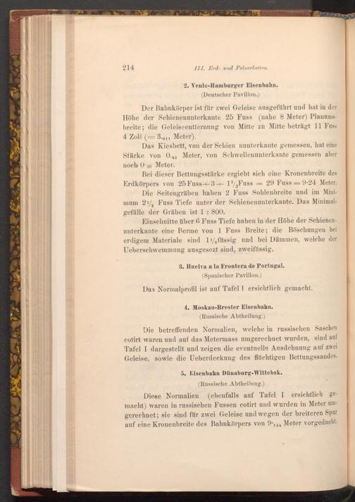 Diese Normalien( ebenfalls auf Tafel I ersichtlich gemacht) waren in russischen Fussen cotirt und wurden in Meter umgerechnet; sie sind für zwei Geleise und wegen der breiteren Spur auf eine Kronenbreite des Bahnkörpers von 9144 Meter vorgedacht.