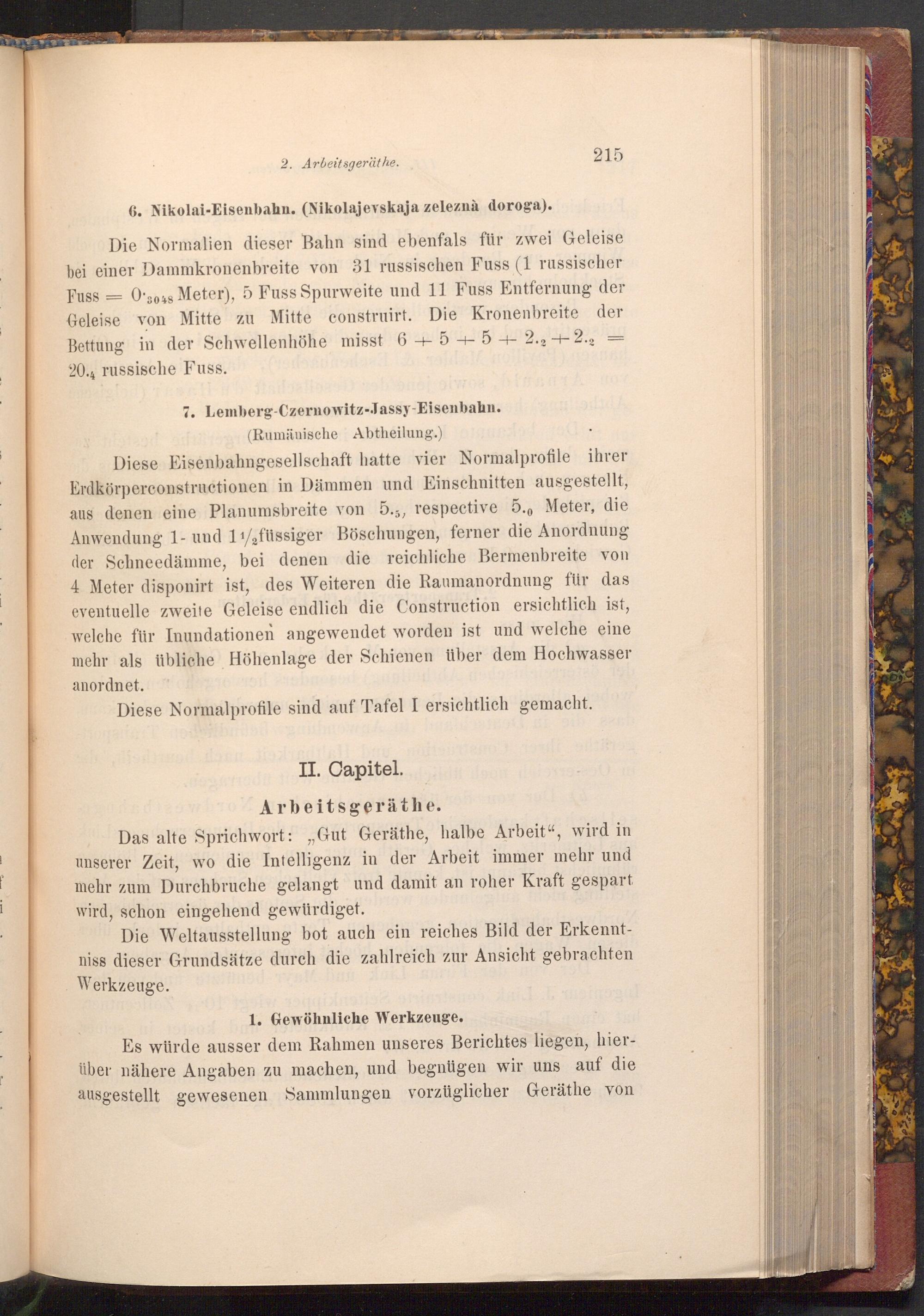 Die Normalien dieser Bahn sind ebenfals für zwei Geleise bei einer Dammkronenbreite von 31 russischen Fuss( 1 russischer Fuss O'3048 Meter), 5 Fuss Spurweite und 11 Fuss Entfernung der Geleise von Mitte zu Mitte construirt. Die Kronenbreite der Bettung in der Schwellenhöhe misst 6+ 5+5+2.2+2.2 20.4 russische Fuss.