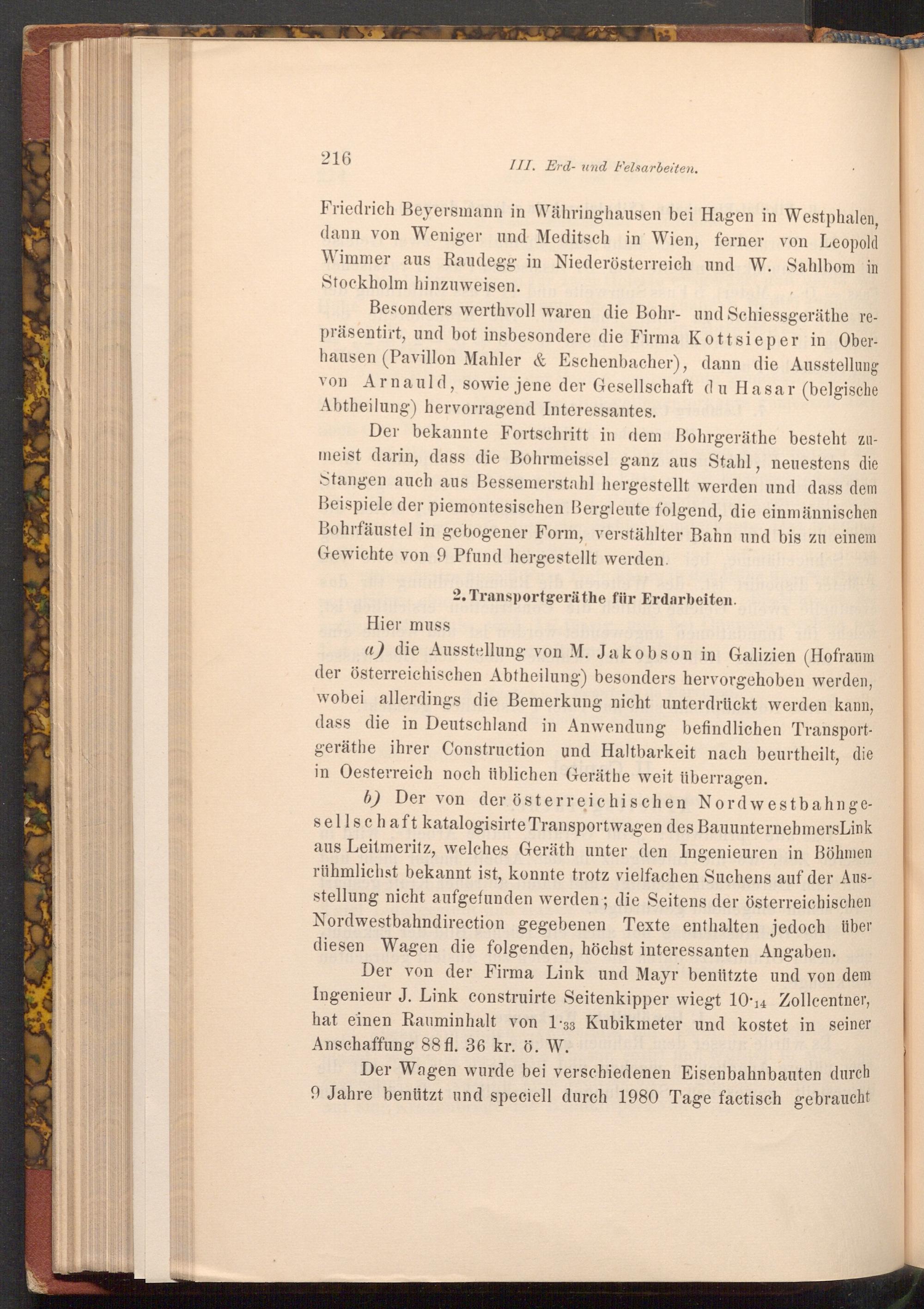 a) die Ausstellung von M. Jakobson in Galizien( Hofraum der österreichischen Abtheilung) besonders hervorgehoben werden, wobei allerdings die Bemerkung nicht unterdrückt werden kann, dass die in Deutschland in Anwendung befindlichen Transportgeräthe ihrer Construction und Haltbarkeit nach beurtheilt, die in Oesterreich noch üblichen Geräthe weit überragen.