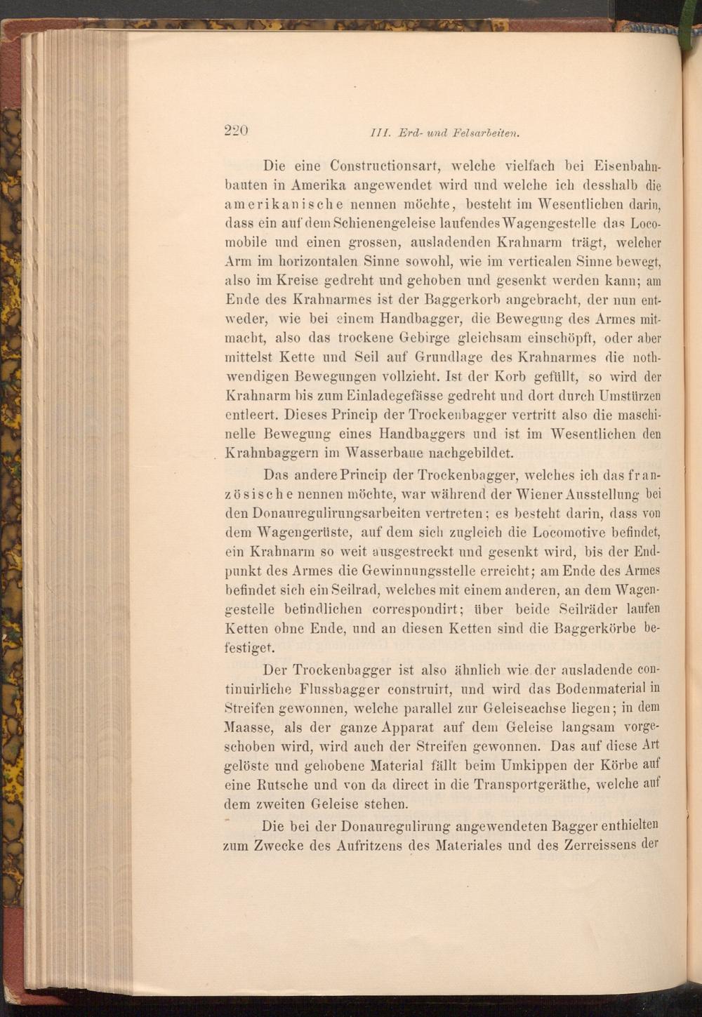 Die eine Constructionsart, welche vielfach bei Eisenbahnbauten in Amerika angewendet wird und welche ich desshalb die amerikanische nennen möchte, besteht im Wesentlichen darin, dass ein auf dem Schienengeleise laufendes Wagengestelle das Locomobile und einen grossen, ausladenden Krahnarm trägt, welcher Arm im horizontalen Sinne sowohl, wie im verticalen Sinne bewegt, also im Kreise gedreht und gehoben und gesenkt werden kann; am Ende des Krahnarmes ist der Baggerkorb angebracht, der nun entweder, wie bei einem Handbagger, die Bewegung des Armes mitmacht, also das trockene Gebirge gleichsam einschöpft, oder aber mittelst Kette und Seil auf Grundlage des Krahnarmes die nothwendigen Bewegungen vollzieht. Ist der Korb gefüllt, so wird der Krahnarm bis zum Einladegefässe gedreht und dort durch Umstürzen entleert. Dieses Princip der Trockenbagger vertritt also die maschinelle Bewegung eines Handbaggers und ist im Wesentlichen den Krahnbaggern im Wasserbaue nachgebildet.