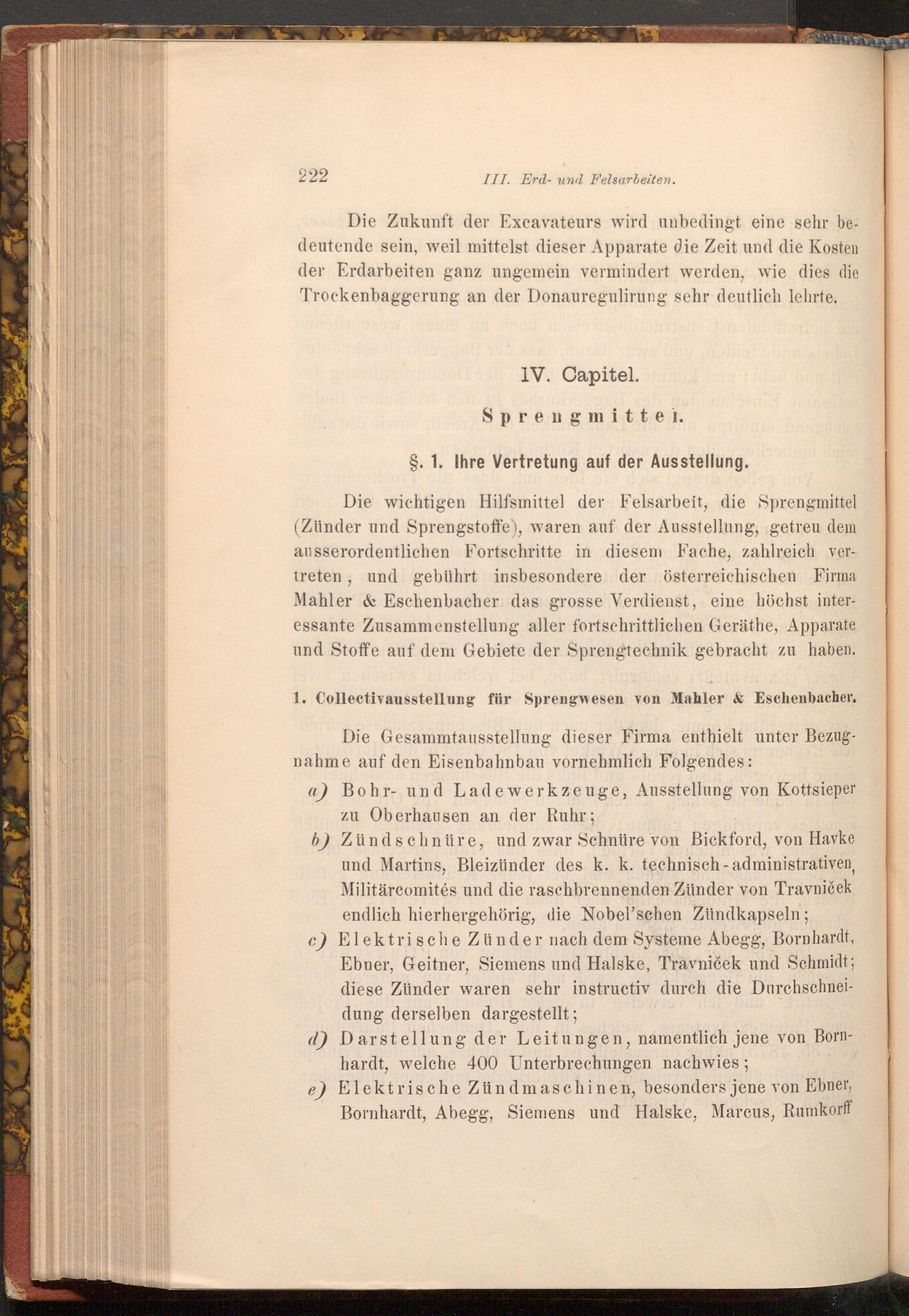 Die wichtigen Hilfsmittel der Felsarbeit, die Sprengmittel ( Zünder und Sprengstoffe), waren auf der Ausstellung, getreu dem ausserordentlichen Fortschritte in diesem Fache, zahlreich vertreten, und gebührt insbesondere der österreichischen Firma Mahler& Eschenbacher das grosse Verdienst, eine höchst interessante Zusammenstellung aller fortschrittlichen Geräthe, Apparate und Stoffe auf dem Gebiete der Sprengtechnik gebracht zu haben. 1. Collectivausstellung für Sprengwesen von Mahler& Eschenbacher. Die Gesammtausstellung dieser Firma enthielt unter Bezugnahme auf den Eisenbahnbau vornehmlich Folgendes: a) Bohr- und Ladewerkzeuge, Ausstellung von Kottsieper zu Oberhausen an der Ruhr;