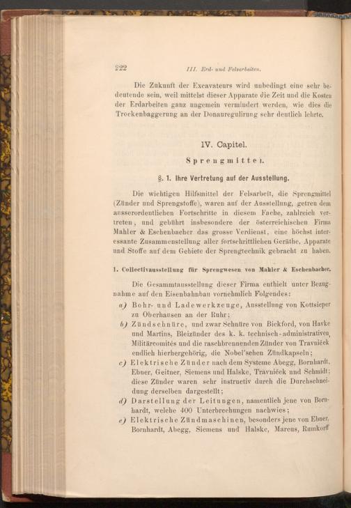 b) Zündschnüre, und zwar Schnüre von Bickford, von Havke und Martins, Bleizünder des k. k. technisch- administrativen, Militärcomités und die raschbrennenden Zünder von Travniček endlich hierhergehörig, die Nobel'schen Zündkapseln; c) Elektrische Zünder nach dem Systeme Abegg, Bornhardt, Ebner, Geitner, Siemens und Halske, Travniček und Schmidt; diese Zünder waren sehr instructiv durch die Durchschneidung derselben dargestellt;