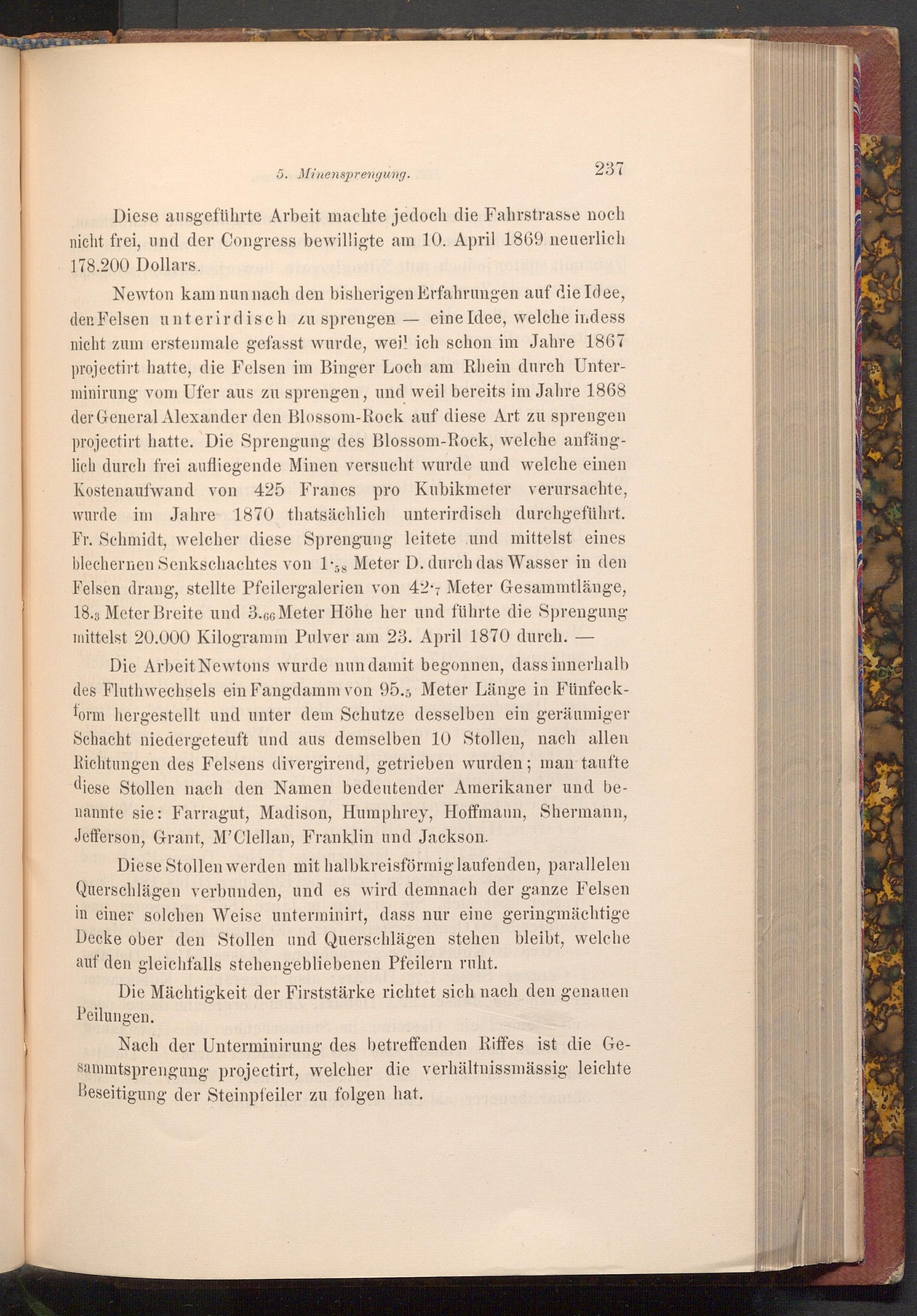 Newton kam nun nach den bisherigen Erfahrungen auf die Idee, der Felsen unterirdisch zu sprengen eine Idee, welche indess nicht zum erstenmale gefasst wurde, weil ich schon im Jahre 1867 projectirt hatte, die Felsen im Binger Loch am Rhein durch Unterminirung vom Ufer aus zu sprengen, und weil bereits im Jahre 1868 der General Alexander den Blossom- Rock auf diese Art zu sprengen projectirt hatte. Die Sprengung des Blossom- Rock, welche anfänglich durch frei aufliegende Minen versucht wurde und welche einen Kostenaufwand von 425 Francs pro Kubikmeter verursachte, wurde im Jahre 1870 thatsächlich unterirdisch durchgeführt. Fr. Schmidt, welcher diese Sprengung leitete und mittelst eines blechernen Senkschachtes von 1.58 Meter D. durch das Wasser in den Felsen drang, stellte Pfeilergalerien von 427 Meter Gesammtlänge, 18.3 Meter Breite und 3.66 Meter Höhe her und führte die Sprengung mittelst 20.000 Kilogramm Pulver am 23. April 1870 durch.