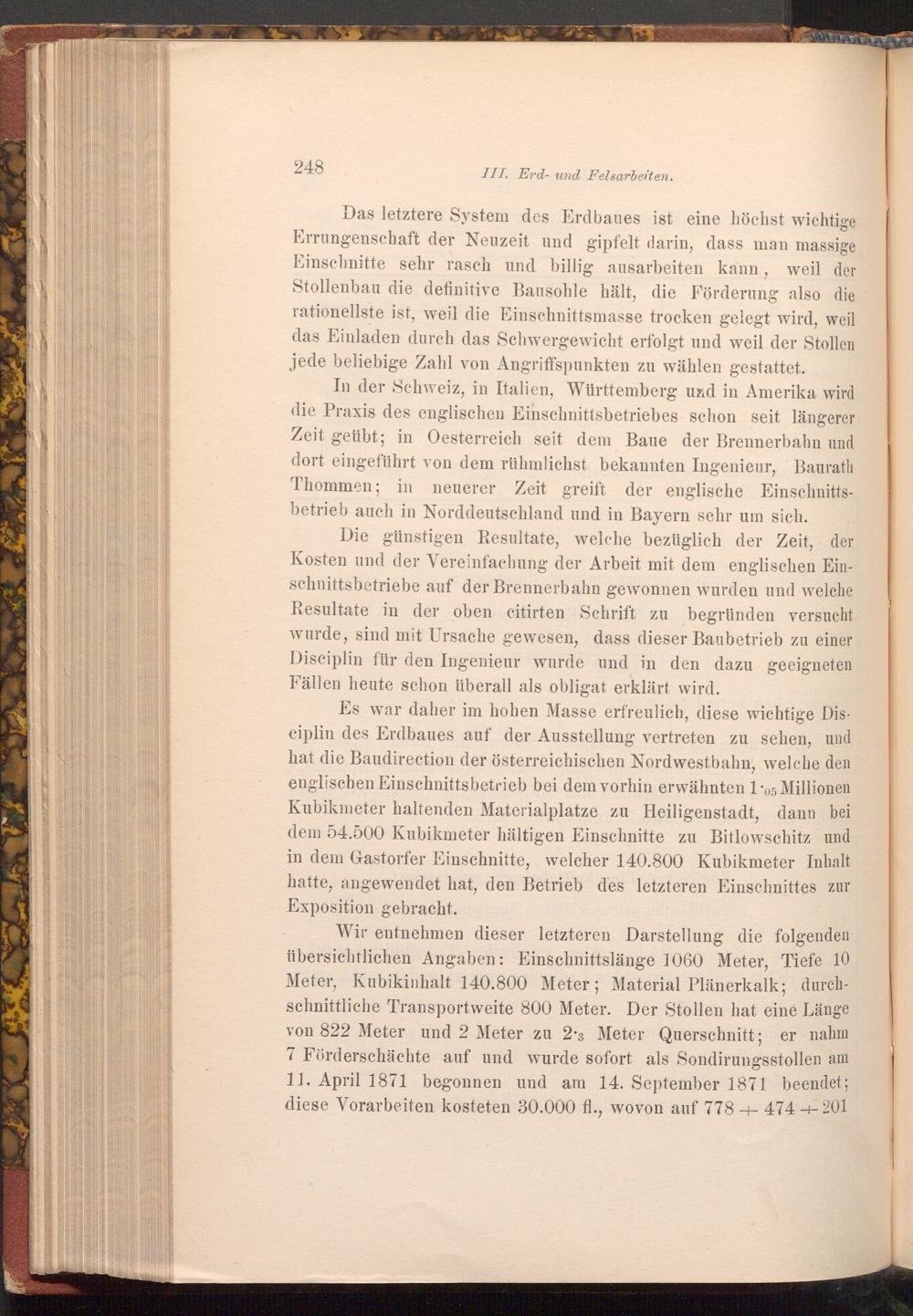 Wir entnehmen dieser letzteren Darstellung die folgenden übersichtlichen Angaben: Einschnittslänge 1060 Meter, Tiefe 10 Meter, Kubikinhalt 140.800 Meter; Material Plänerkalk; durchschnittliche Transportweite 800 Meter. Der Stollen hat eine Länge von 822 Meter und 2 Meter zu 23 Meter Querschnitt; er nahm 7 Förderschächte auf und wurde sofort als Sondirungsstollen am 11. April 1871 begonnen und am 14. September 1871 beendet; diese Vorarbeiten kosteten 30.000 fl., wovon auf 778+474+201