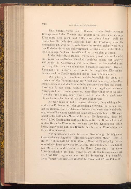 Die günstigen Resultate, welche bezüglich der Zeit, der Kosten und der Vereinfachung der Arbeit mit dem englischen Einschnittsbetriebe auf der Brennerbahn gewonnen wurden und welche Resultate in der oben citirten Schrift zu begründen versucht wurde, sind mit Ursache gewesen, dass dieser Baubetrieb zu einer Disciplin für den Ingenieur wurde und in den dazu geeigneten Fällen heute schon überall als obligat erklärt wird.