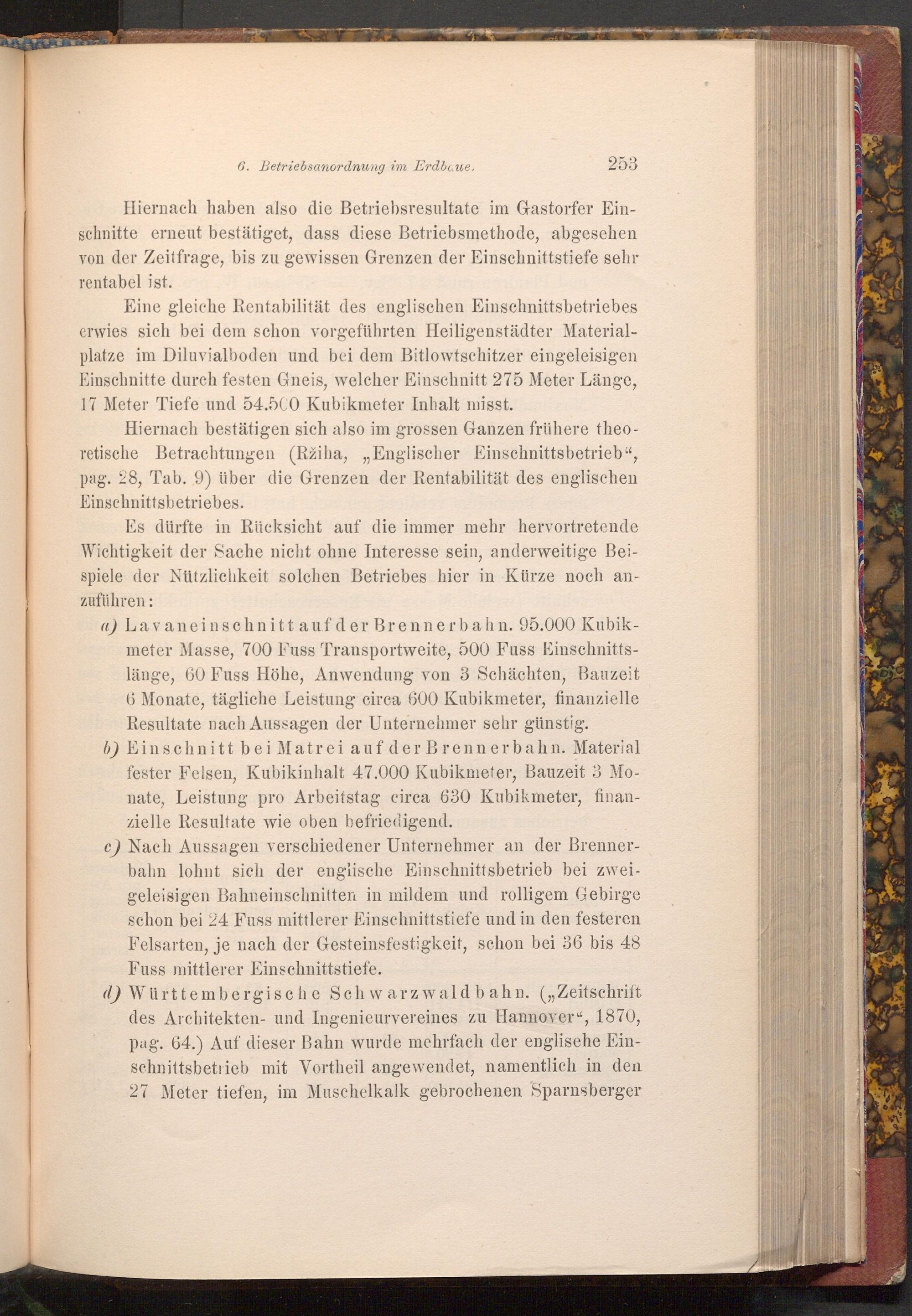c) Nach Aussagen verschiedener Unternehmer an der Brennerbahn lohnt sich der englische Einschnittsbetrieb bei zweigeleisigen Bahneinschnitten in mildem und rolligem Gebirge schon bei 24 Fuss mittlerer Einschnittstiefe und in den festeren Felsarten, je nach der Gesteinsfestigkeit, schon bei 36 bis 48 Fuss mittlerer Einschnittstiefe.