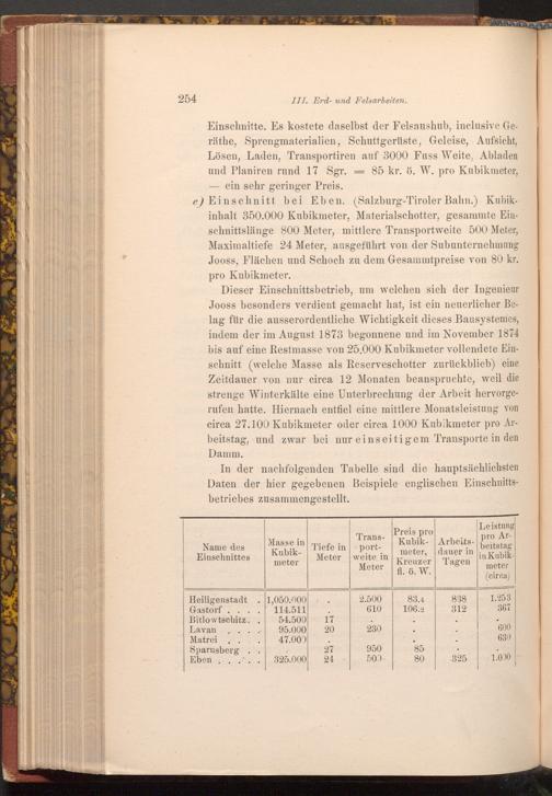 e) Einschnitt bei Eben.( Salzburg- Tiroler Bahn.) Kubikinhalt 350.000 Kubikmeter, Materialschotter, gesammte Einschnittslänge 800 Meter, mittlere Transportweite 500 Meter, Maximaltiefe 24 Meter, ausgeführt von der Subunternehmung Jooss, Flächen und Schoch zu dem Gesammtpreise von 80 kr. pro Kubikmeter.